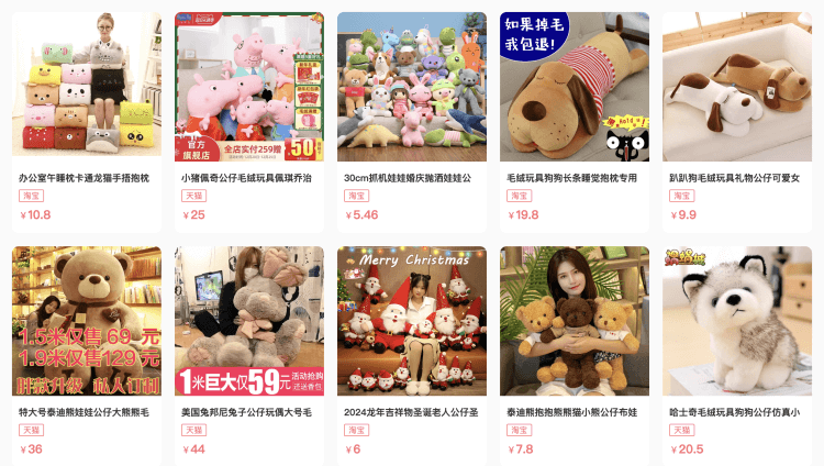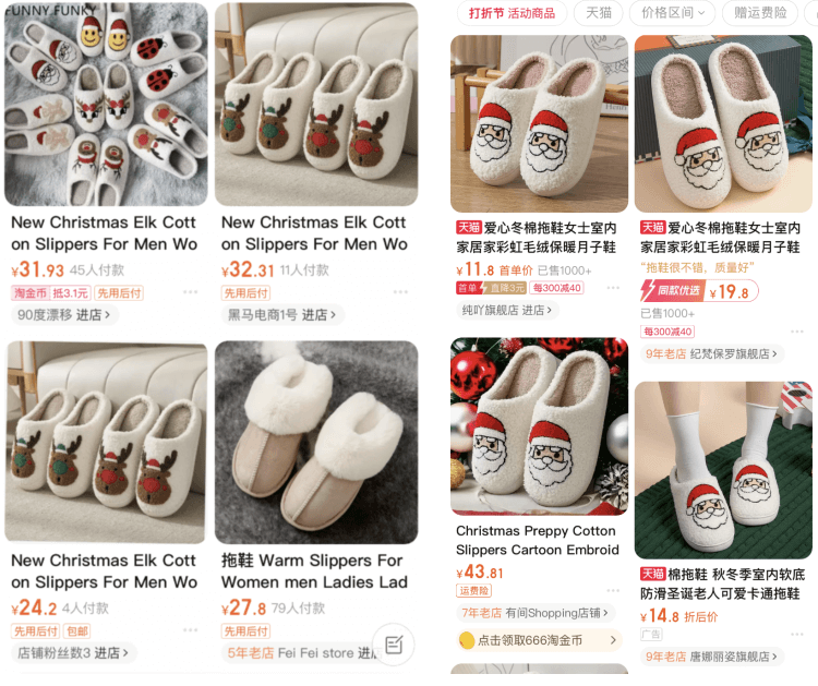 我们尝试在淘宝上输入“slippers”(拖鞋),在搜索结果中找到了一款应季的圣诞款毛绒拖鞋,价格在30-45元之间不等。可当我们点击进入商品图后,通过软件自带的“找相似”功能进行搜索,却发现相同款式的中文商品价格几乎“腰斩”: