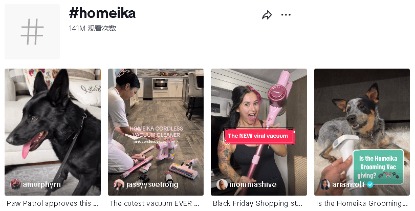 而 Homeika 店铺里无绳吸尘器和宠物毛发吸尘器这两款产品的接连爆火,也带动了品牌标签 #homeika 和 #homeikaofficial 分别获得 1.41 亿次和 1.19 亿次的播放,而且话题热度还在持续飙升中。
