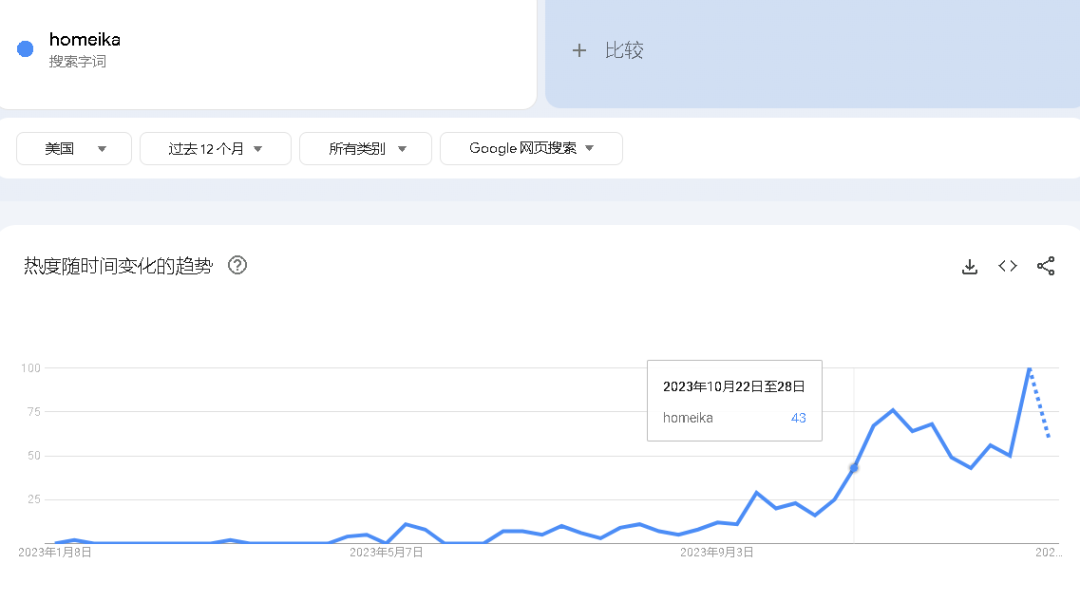 根据 Google Trends 的数据显示,在产品上线 TikTok 美区后,随着 TikTok 上大量种草视频的传播以及产品热度的持续走高,关键词“Homeika”在美国地区的搜索热度也出现了显著上升。