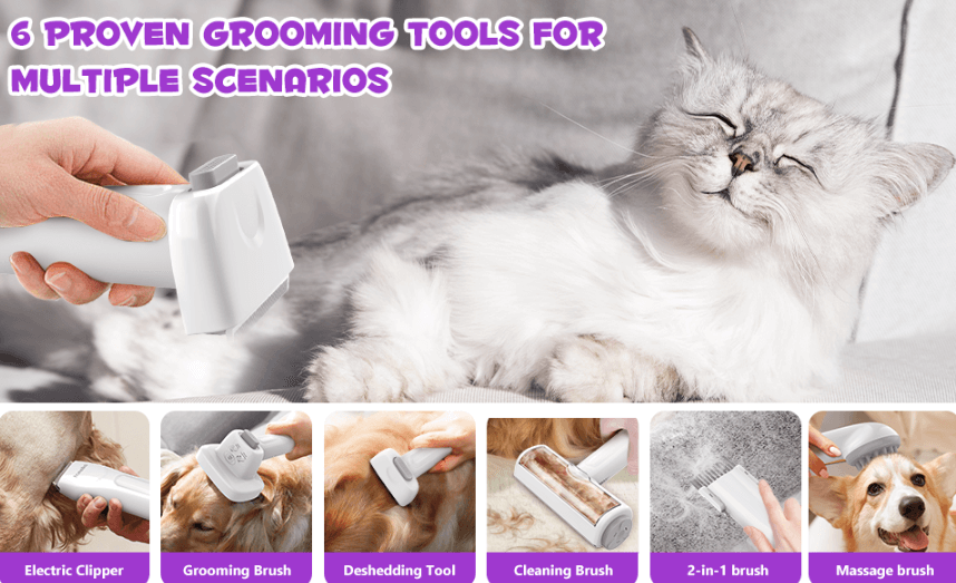 Homeika 热卖的这款多合一宠物毛发真空吸尘器配有梳理刷、脱毛刷、电动理发器、爪子修剪器等 8 种不同用途的美容工具;6 种不同尺寸的可调节易清洗的导向梳,适用于剃除不同长度的宠物毛发;1.5 升大容量的尘杯在减少用户清理集尘杯的频率的同时也能提高修剪的效率。
