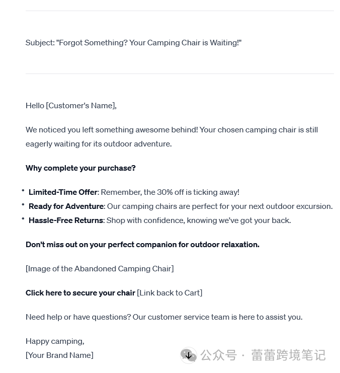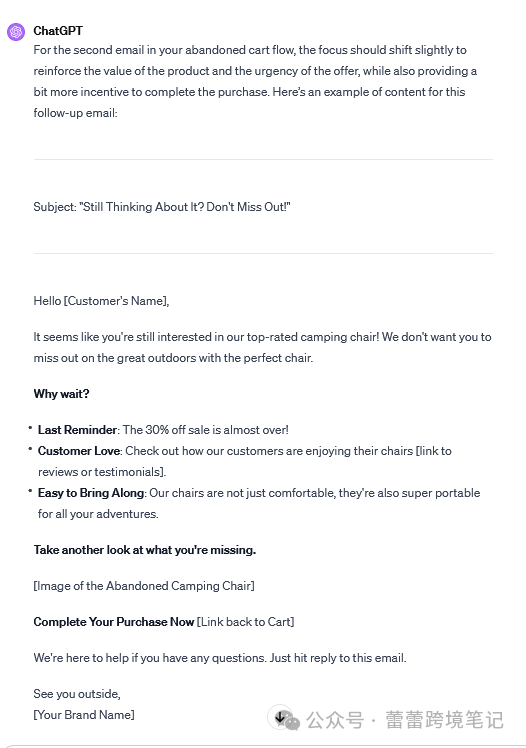 ChatGPT: 当然可以!为您的户外产品品牌独立站,特别是促销露营椅的30%折扣限时优惠,这里有一些吸引人的EDM邮件营销标题建议: