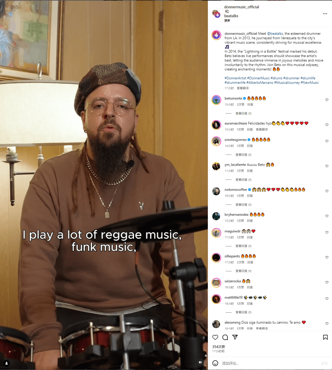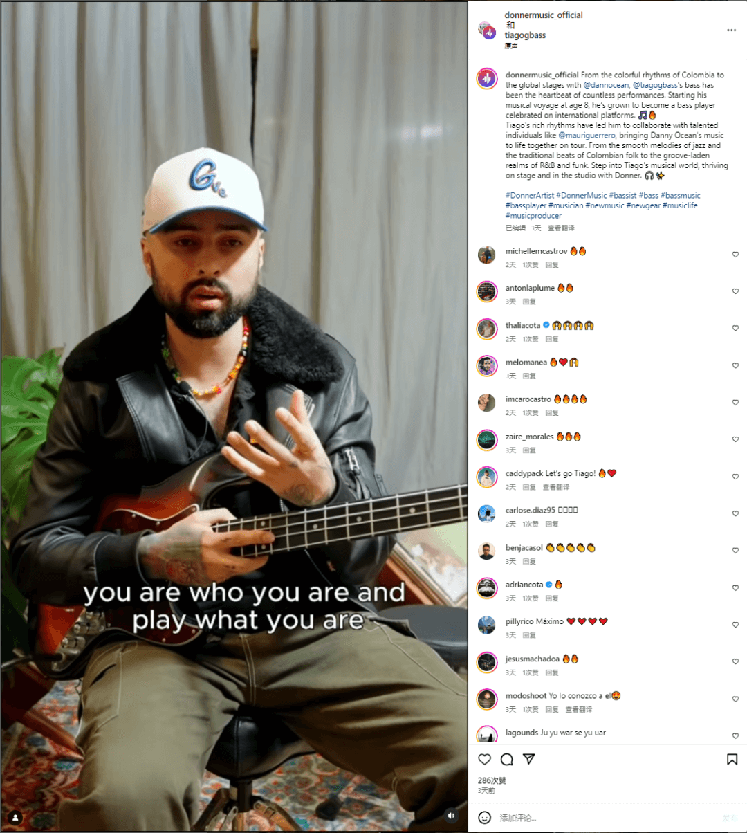 在这些被采访者中,既有著名的贝斯手Tiago,还有吉他手Mauricio Guerrero,甚至还有鼓手Andy Prado。Donner在选择采访者时,并没有局限于吉他、架子鼓这类“大众的”品类,而是从自身产品出发,去寻找合适的采访对象。