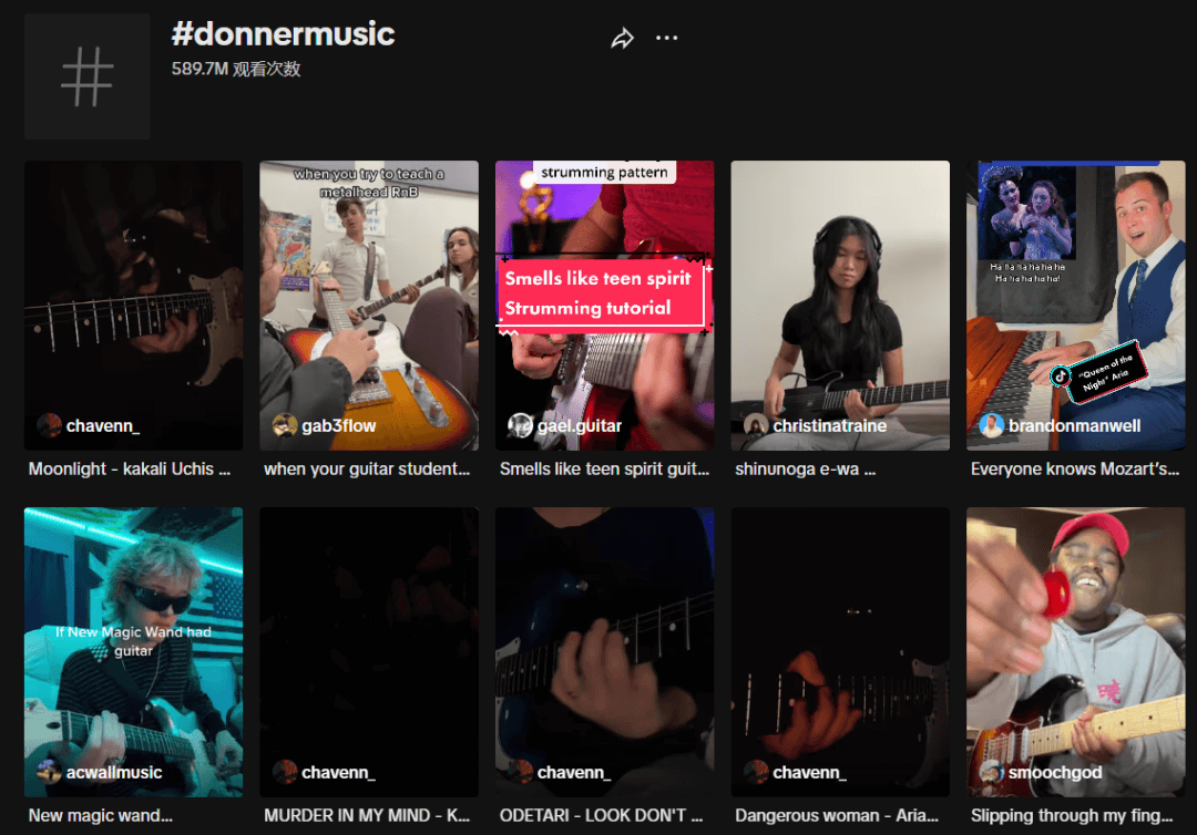 同时,和Gabe一样,Christina也在视频简介处指明了Donner的账号地址,并且也打上了相关标签。其实,类似于Christina这样的音乐红人,Donner还合作了非常多。在TikTok上#donnermusic标签下的内容浏览量就已经达到了5.9亿次!