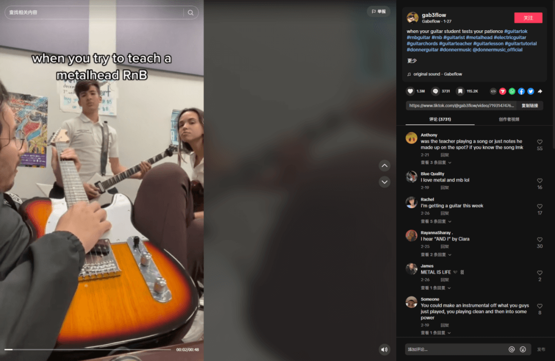 这条在外行看来平常的视频引起了很多吉他初学者和老手的共鸣,视频最终收获了130万次点赞和3731条评论,数据非常不错。Gabe在视频简介处指明了Donner的TikTok账号地址,并打上了相关标签,大大方便了品牌方引流。