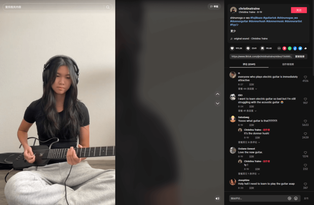 Christina将这首时下非常流行的单曲用摇滚的风格呈现了出来,高超的技巧丝毫没有让听众觉得违和。最终,该条视频收获了911.2k次点赞和2541条评论,数据非常赞。