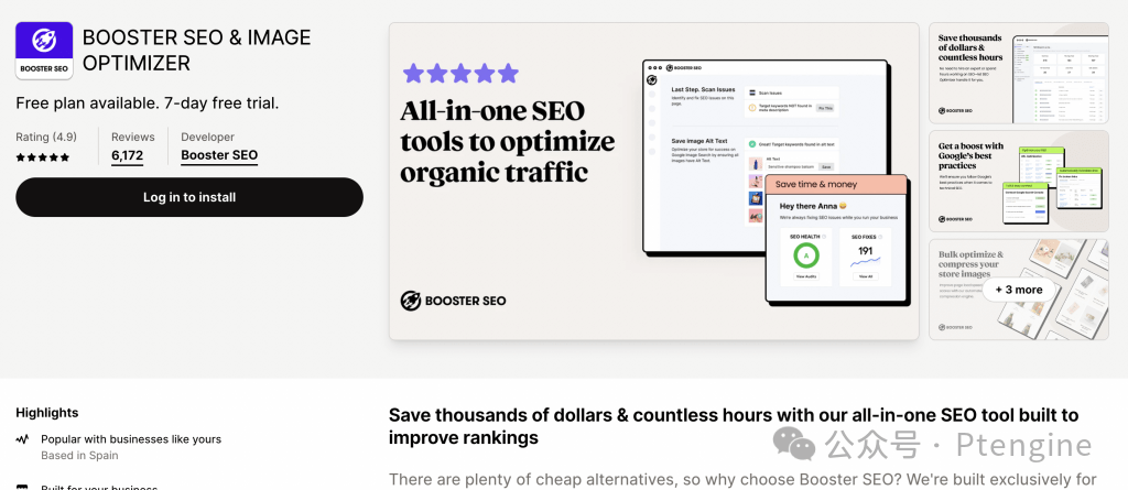 4. SEO Booster: 这款一站式解决方案覆盖了广泛的SEO需求。从处理404报错到优化图片再到提升网站速度,SEO Booster就像是你电商SEO的瑞士军刀。它尤其适用于那些有大量库存想要大规模管理SEO任务的网站。