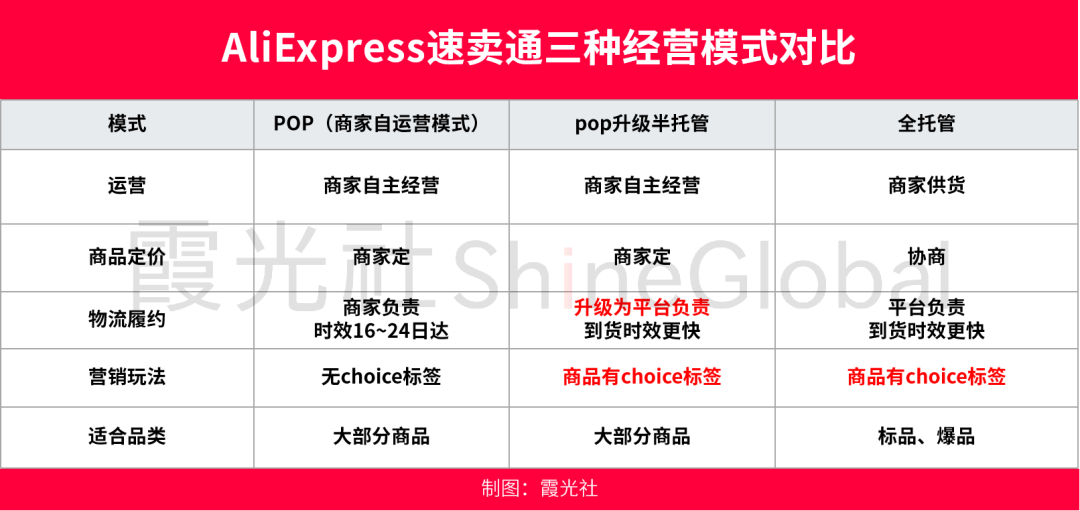 去年,全托管业务取得成功之后,速卖通总结经验,首创半托管模式。通过半托管模式,原本的第三方自运营卖家(POP)也能升级物流,商品进入Choice。