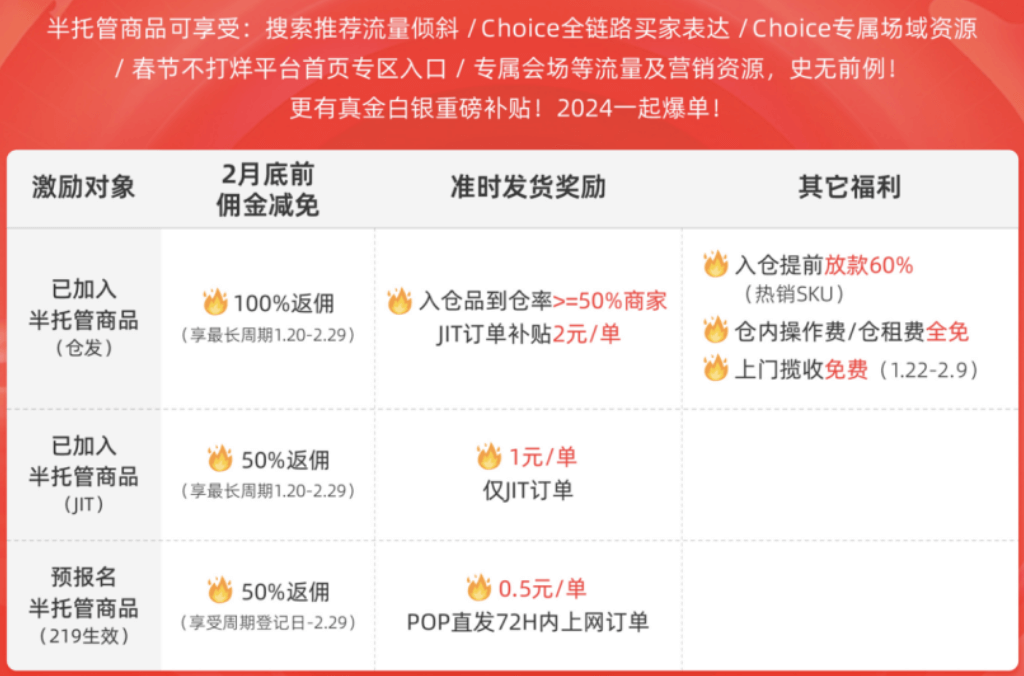 这也使得2024年第一周,速卖通就决定全面上线半托管,从定向邀请改为所有卖家皆可申请加入,并提供一系列物流补贴、免佣金、免仓库费用等福利。
