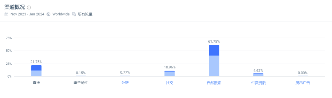 从流量来源看,自然搜索及直接访问占据了所有流量渠道的80%以上,已经极具品牌知名度。