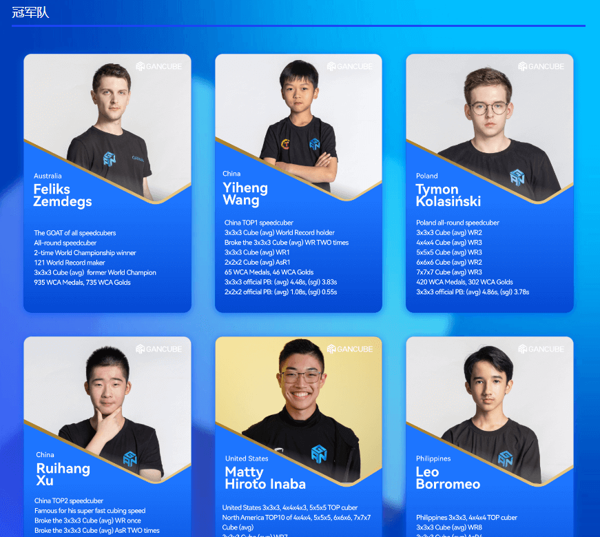 其GAN战队成员包含了百项世界纪录创者者的澳大利亚选手FeliksZemdegs;3x3x3立方体(平均值)世界纪录保持者的中国小将王艺衡;创下三阶魔方4.86秒最新世界纪录的波兰选手Tymon Kolasiński等42名成员,已蝉联4届世锦赛冠军。
