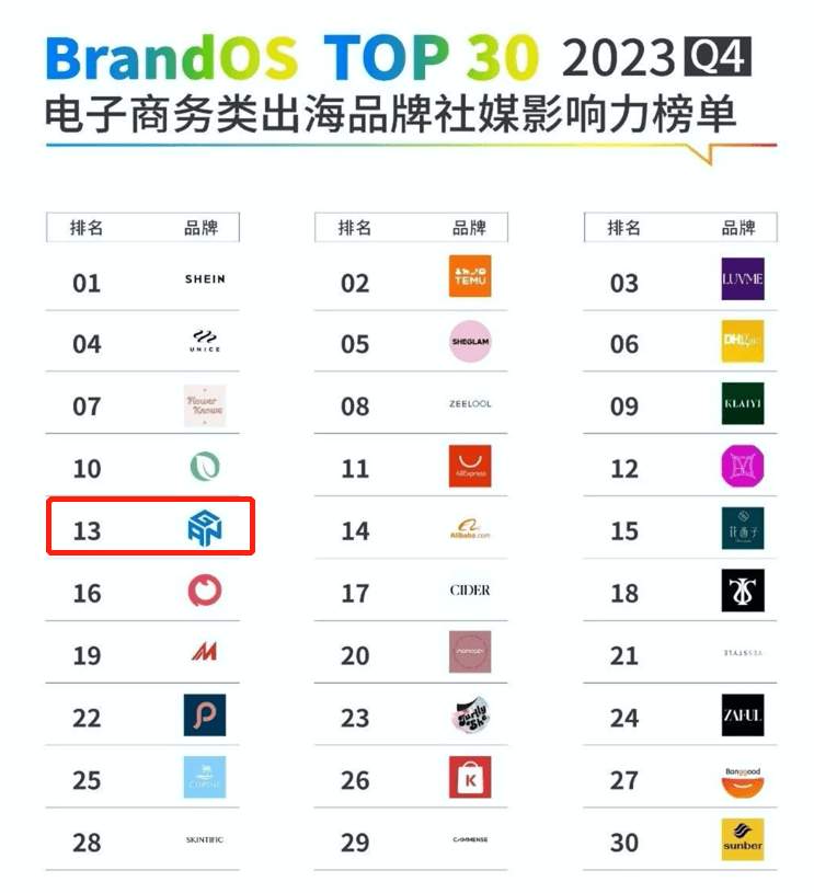 在BrandOs发布的《2023 Q4电子商务类出海品牌社媒影响力榜单》中超越了花西子、cider等一众出海品牌来到了13顺位。