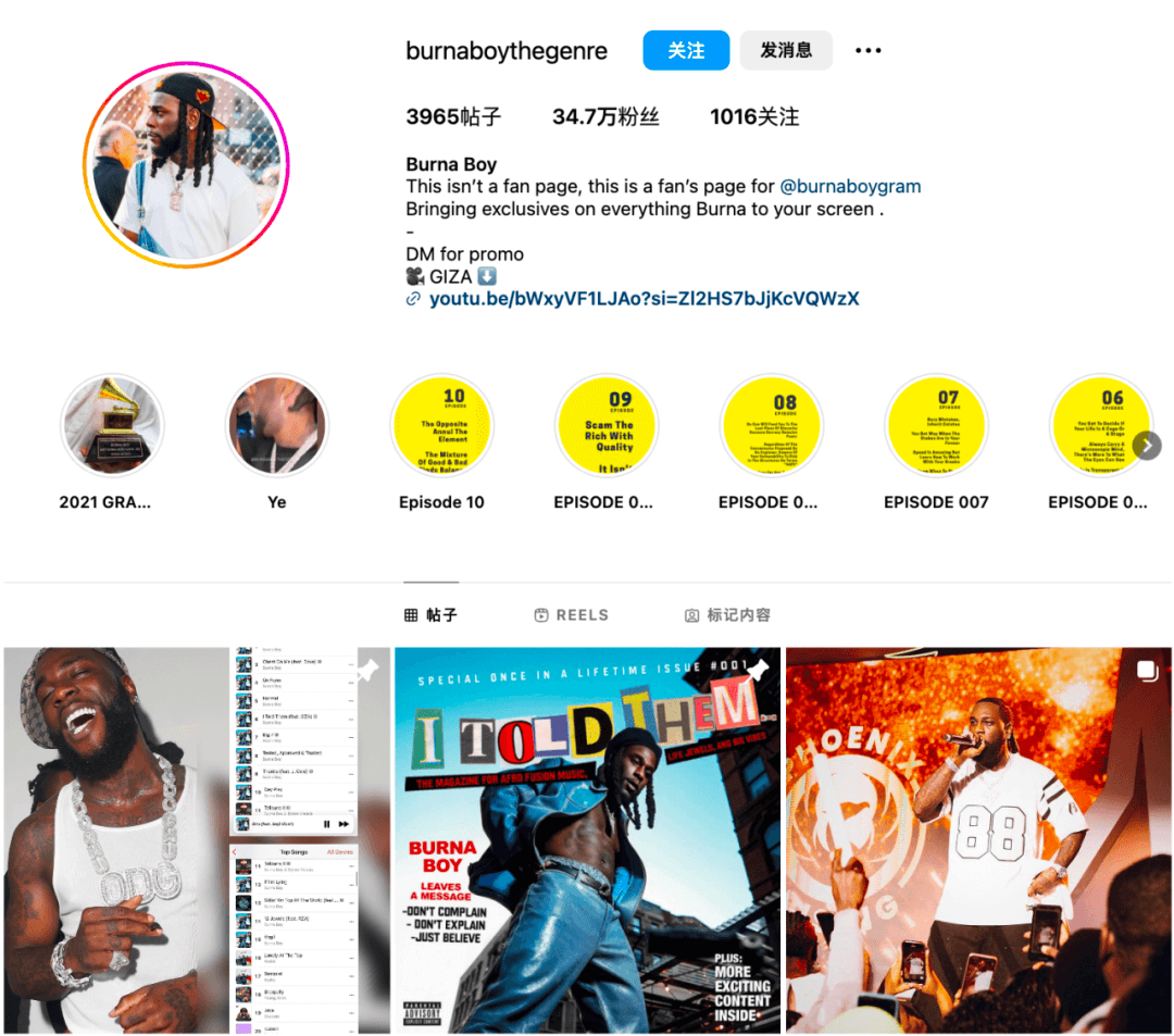 同时,品牌还联合Burna Boy的官方粉丝号,例如burnaboythegenre做推广。虽然相对于Burna Boy本人1600万的粉丝数量,burnaboythegenre只有34.7万名粉丝,但是他们都是Burna Boy的忠实粉丝,对于SpacePods的接受度更高,且自发推广的意愿更强。
