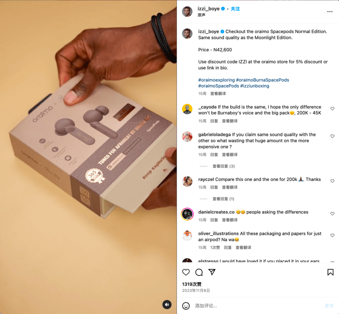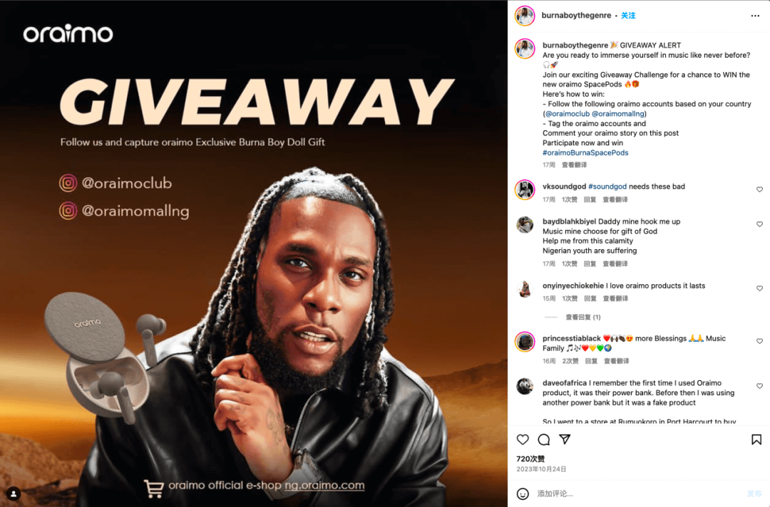 尼日利亚是Oraimo销量最好的地区也是Burna Boy的家乡,因此该地区的官方账号Oraimoclub就承担了此次合作的落地工作。同时,Oraimo的其他非洲国家账号也承担了内容分发的策略。