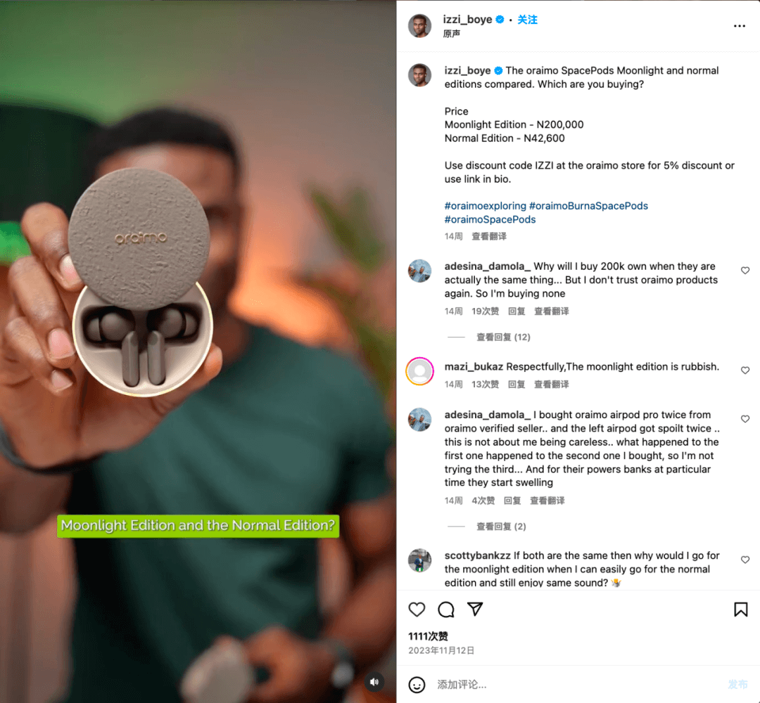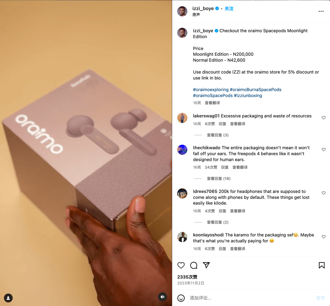此外,Oraimo还设计了两个专属话题标签#oraimospacepods、#oraimoburnaspacepods,且他们的总帖数也已经达到了723条,相对于其他在非洲的同类品牌或单品来说,显然非常突出。