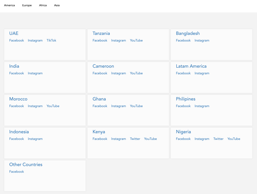 打开Oraimo的官网,我们能发现品牌目前只在四个地区(欧洲、美国、非洲与亚洲)销售。这四个地区包含了数十个国家、好几种语言以及三个种族。因此,如果想要通过一个账号在社媒平台上展开品宣攻势,那么这注定是徒劳的。