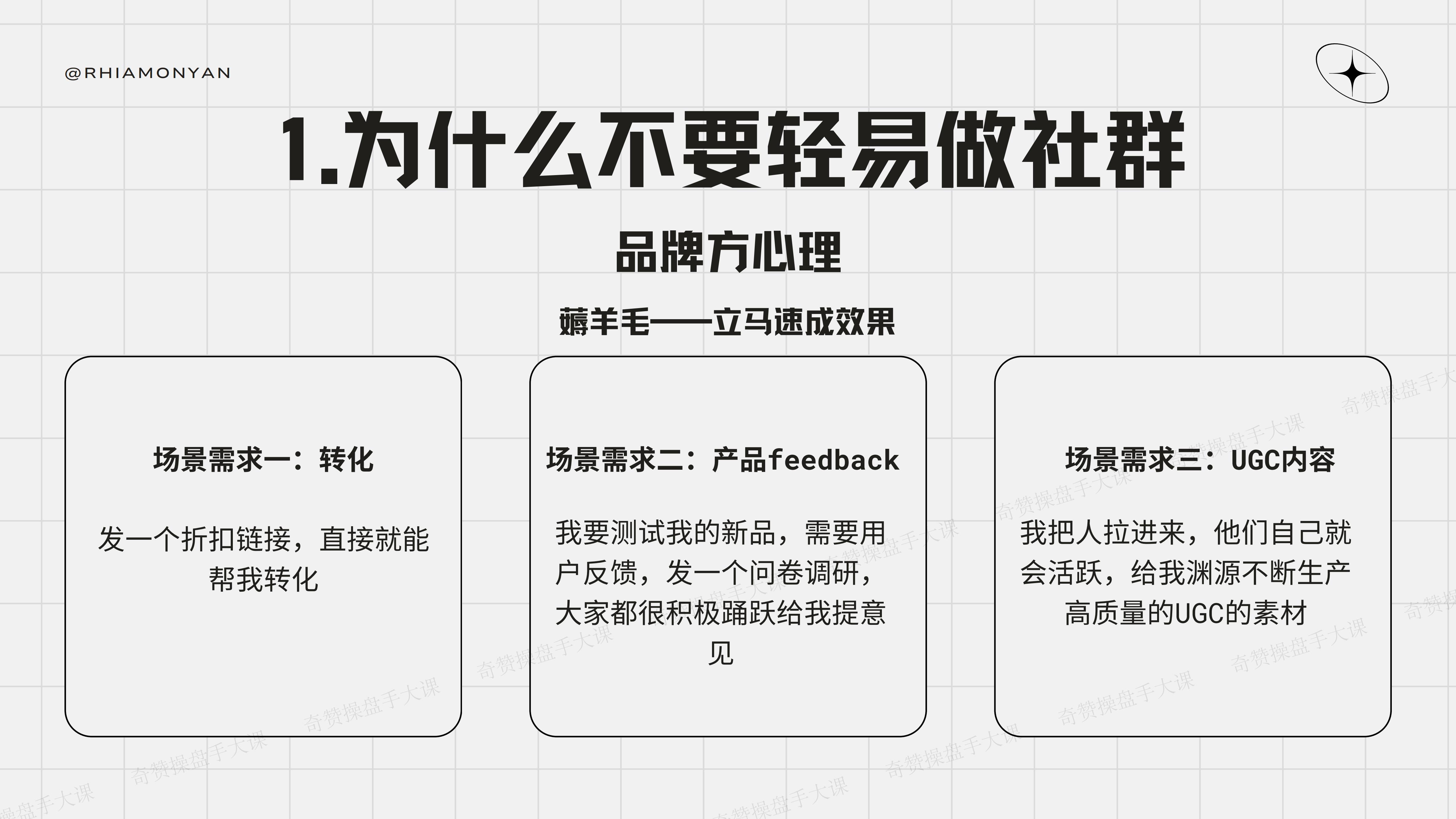 作为品牌方的视角来讲,很简单,这也是我真实遇到的三个场景。首先,我希望建了这个社群,发一个链接,就有转化。第二,上一个新品,需要用户的feedback,需要做问卷调研。第三,我需要UGC内容,建一个社群,发一个活动,用户就来参加。