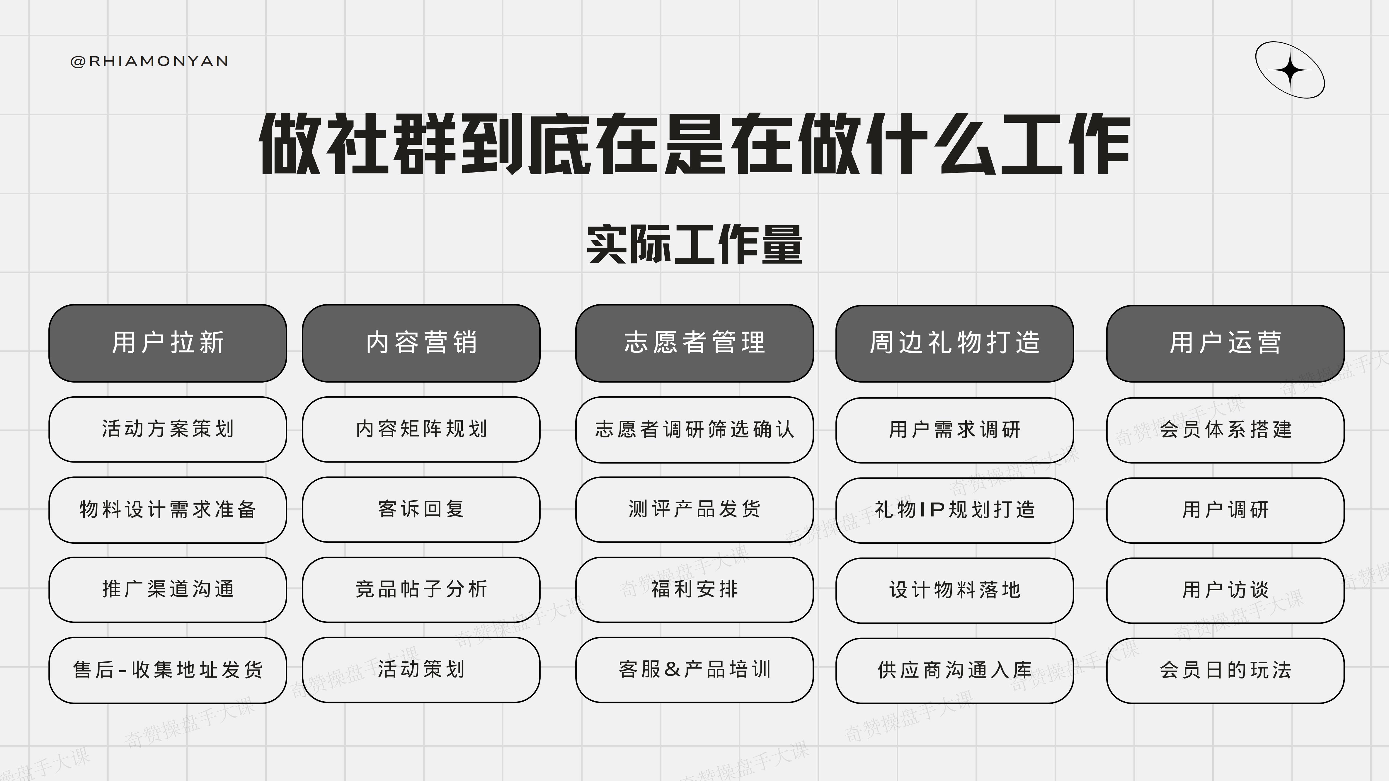 实际工作,主要分五块:用户拉新、内容营销、志愿者管理、周边礼物打造、用户运营。每一块都是我的实战工作内容,这样做下来,你没有四五人、五六人的小团队,你是做不下来的,还有你的成本。