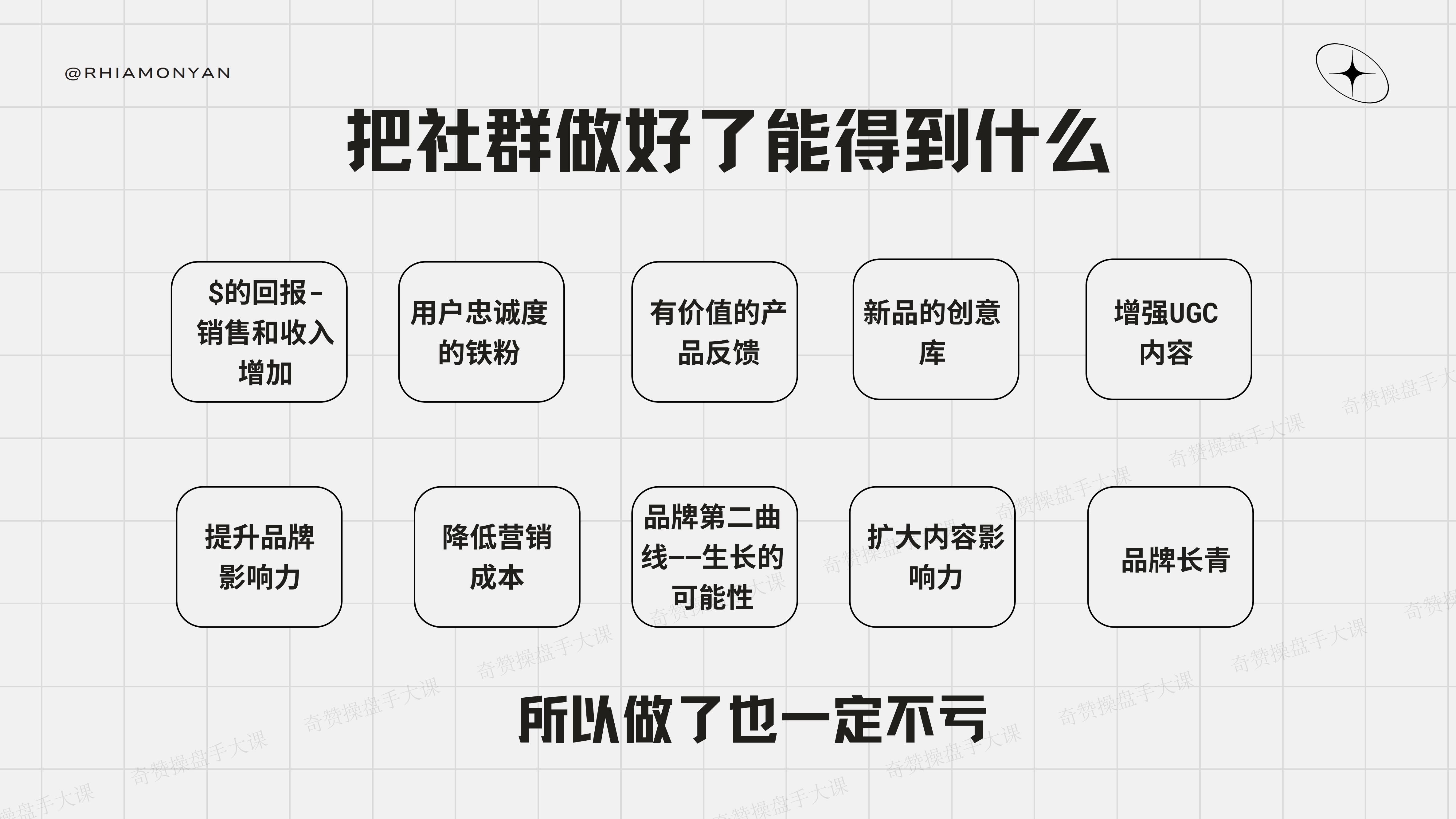 为什么我又说,社群做了一定不亏?把上面的五大点做好了,钱一定是最明显的收获,其次是你的粉丝忠诚度,以及你对于产品的反馈以及idea。我之前做的那家公司,利用用户共创Designer,设计了一款产品,生产出来了,上架10秒钟的时间,3500个就卖掉了,好的品牌一定要往这个方向发展。再就是品牌影响力和品牌第二曲线,这是另一个话题,这里不讲了,你要去做这个,不会说没有用,一定是非常有用的。