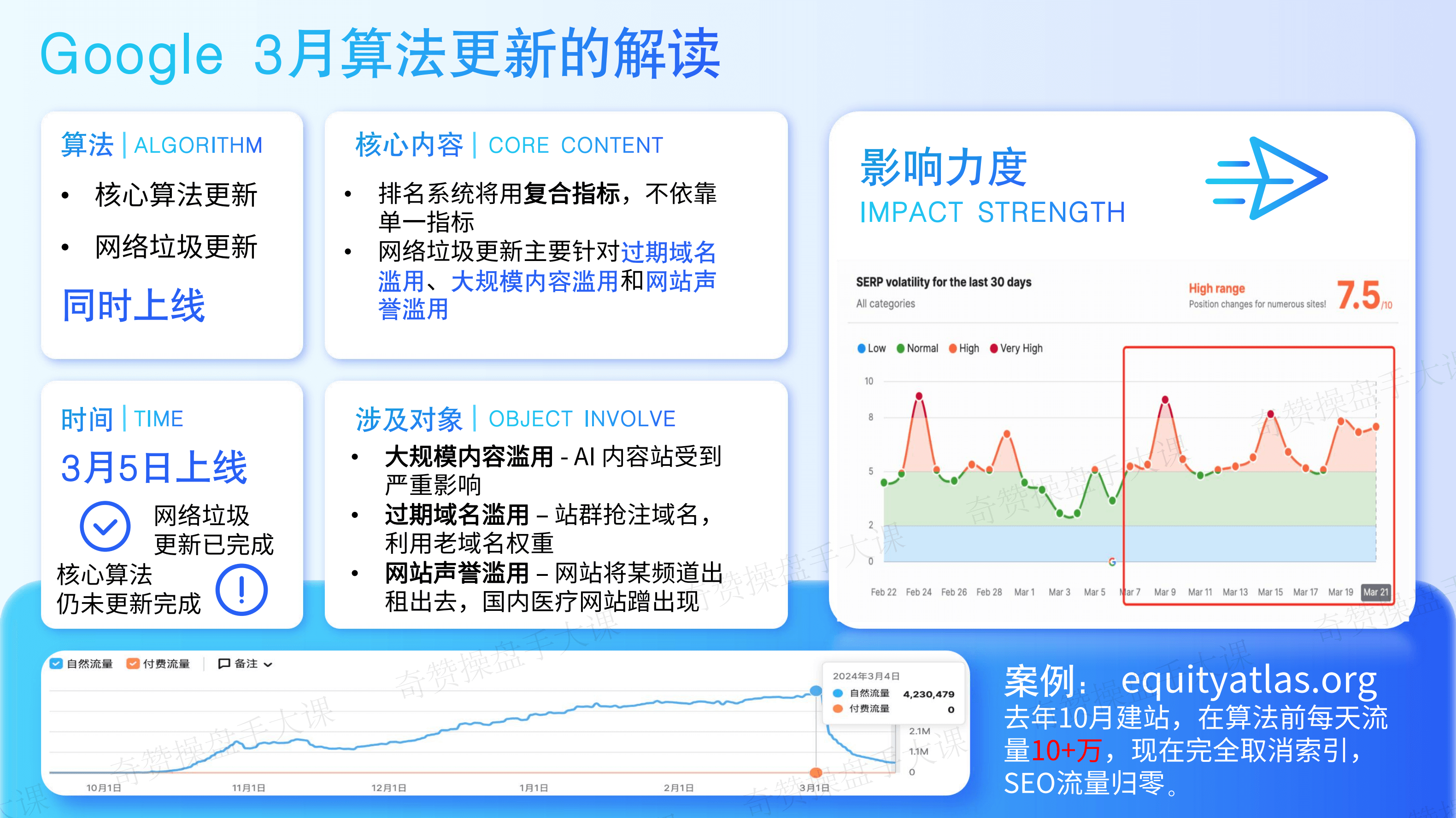 先看一下这次Google 3月算法更新的解读,这次有两个算法同时上线,一个是核心算法更新,第二个是网络垃圾更新。从去年年底到现在,一直在开发这些大型的算法,到3月份就开始憋大招,直接一次上线。现在的时间,我早上还看了一下,网络垃圾的更新已经上线完成了,核心算法的更新还在进行中。