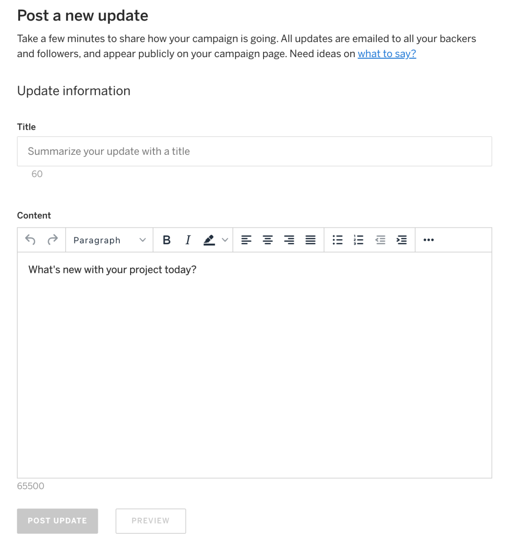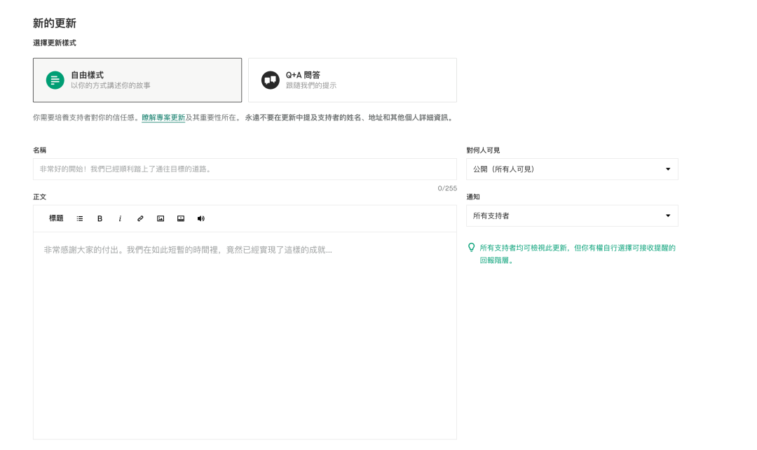 - 我们可以在发布后的30分钟内编辑updates的内容。但每次发布updates内容的时候,所有backers将会通过电子邮件收到未经编辑的版本。