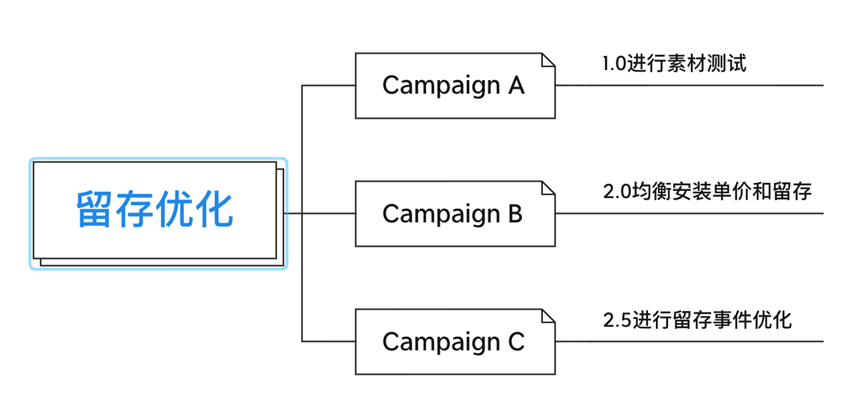 不同的应用安装广告因为优化的方式不同,侧重点也有所不同,具体该如何设置Campaign并分配合适的预算也直接关系到了最后的结果。如果2.5的留存优化效果明显,在提高Campaign C的预算之后,势必会一定程度上提高留存,同时也需要注意随之而来的单价波动。