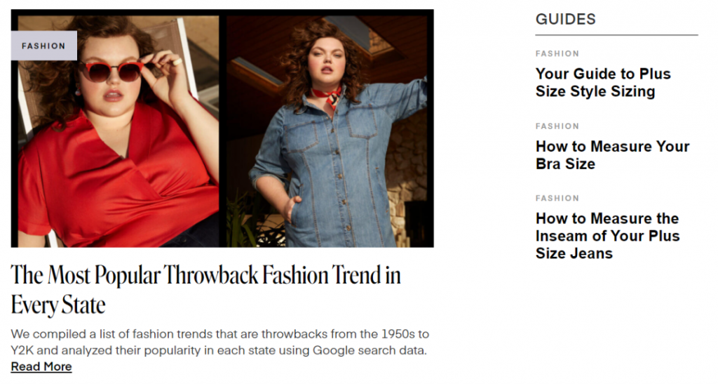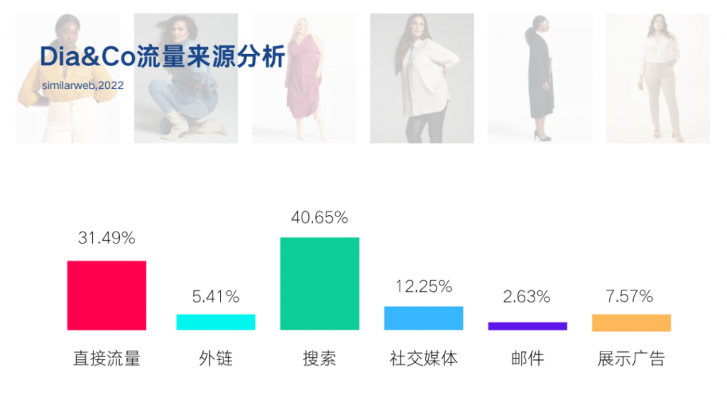 除了社交媒体,关键词搜索是Dia&Co网站的主要流量来源,占所有流量来源的40.65%。其中搜索广告占比38.11%。自然搜索占比61.89%,有555个关键词贡献了自然流量。在关键词部署上,Dia&Co与主打品类大词的Bloomchic不同,他们更偏好比较具体的长尾关键词。创始人Dia会在网站上定期写的博客对品牌的SEO做出了不小的贡献,Dia会在博客中分享自己作为大码女生的经验,鼓励大码女孩勇敢做自己。博客中还有当下的服装流行趋势,搭配建议等等内容。
