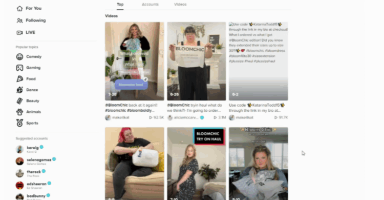 除了自己的品牌账号运营,Bloomchic也很重视红人合作和TikTok短视频&直播。目前,Bloomchic合作的网红多为中小型体量的大码博主如 kendall_leigh96、makeitkat、jadewakeling等,视频播放量在10w左右,也有合作一些粉丝量较大的博主,如aliciamccarvell、haueterfamily等,视频播放量均在百万以上。
