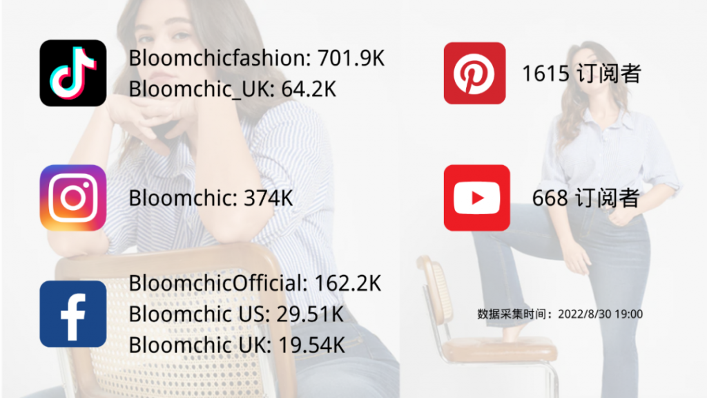 BloomChic也非常重视海外社媒的布局,来自社交媒体的流量占网站总流量的20.28%。Bloomchic在海外主流社交媒体都开创了品牌账号,据统计,该品牌在Instagram、TikTok、Facebook、Pinterest、YouTube上共拥有超过135万的粉丝。Bloomchic的TikTok和Facebook采用了多账号运营的模式,分为了官方主账号,以及英国跟美国两个矩阵号,基本都保持着稳定的图文和视频更新频率。