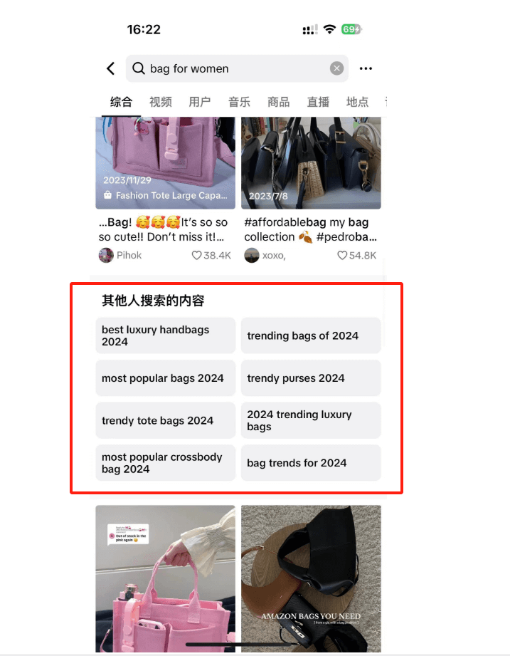 持续,直到你的首页推荐视频,持续出现对应品类的内容,例如bag,全是bag相关