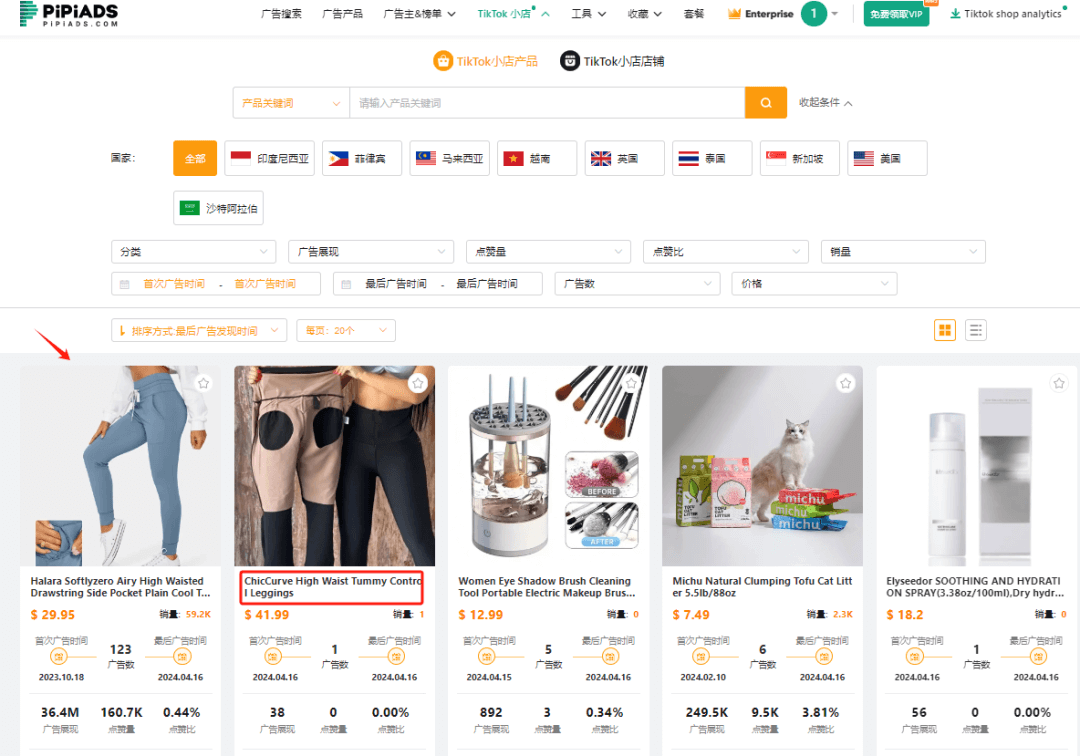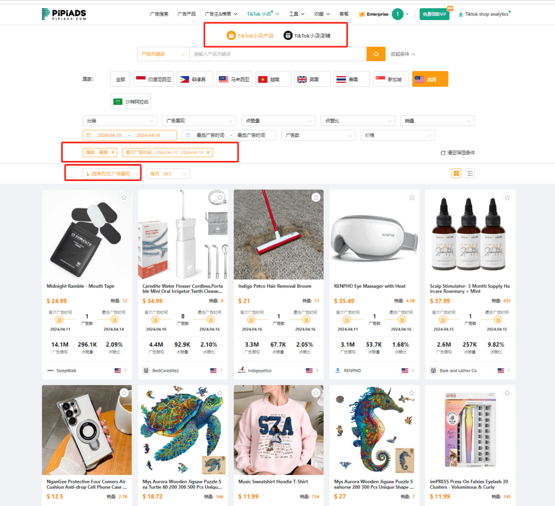 最近七天,选择国家,选择按广告展现排序,或销量排序,查看广告数据