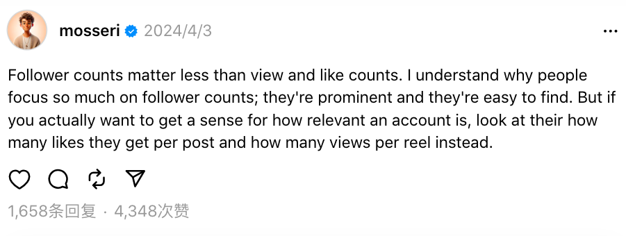 近日,Instagram负责人Adam Mosseri在个人账号中发表了对社交媒体营销中“粉丝”数据的看法,他说:“关注者数量不如观看和点赞数量重要……如果你想了解一个账号的情况,应该查看他们的一条帖子有多少点赞以及一个Reels有多少的观看。”