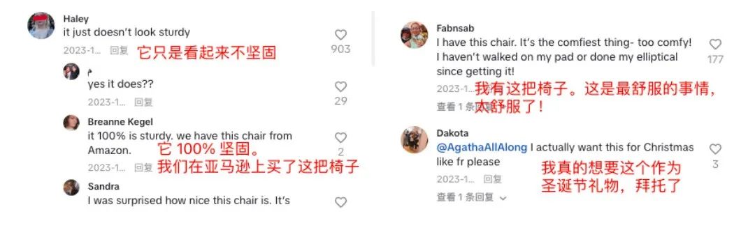 在视频的评论区,可以看到许多TikTok用户对达人视频中所展示的商品效果感到惊讶,并对达人所带货的无扶手椅子产生了浓厚的兴趣。