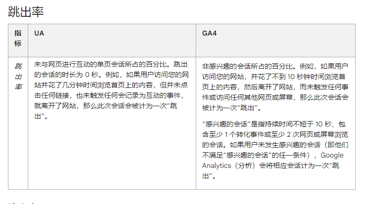 意思是在GA4 中,跳出率是不被视为感兴趣的会话(engaged session-官方中文为感兴趣的会话)的百分比。比如,如果有人浏览一个页面,并在该页面上花费的时间少于10秒,或者他们没有完成任何事件或互动,则该会话将被视作一个跳出。