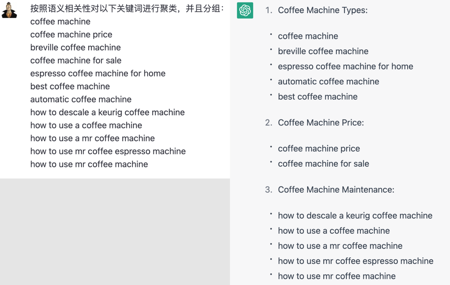 英文指令:Cluster the following keywords into groups based on their semantic relevance: ….