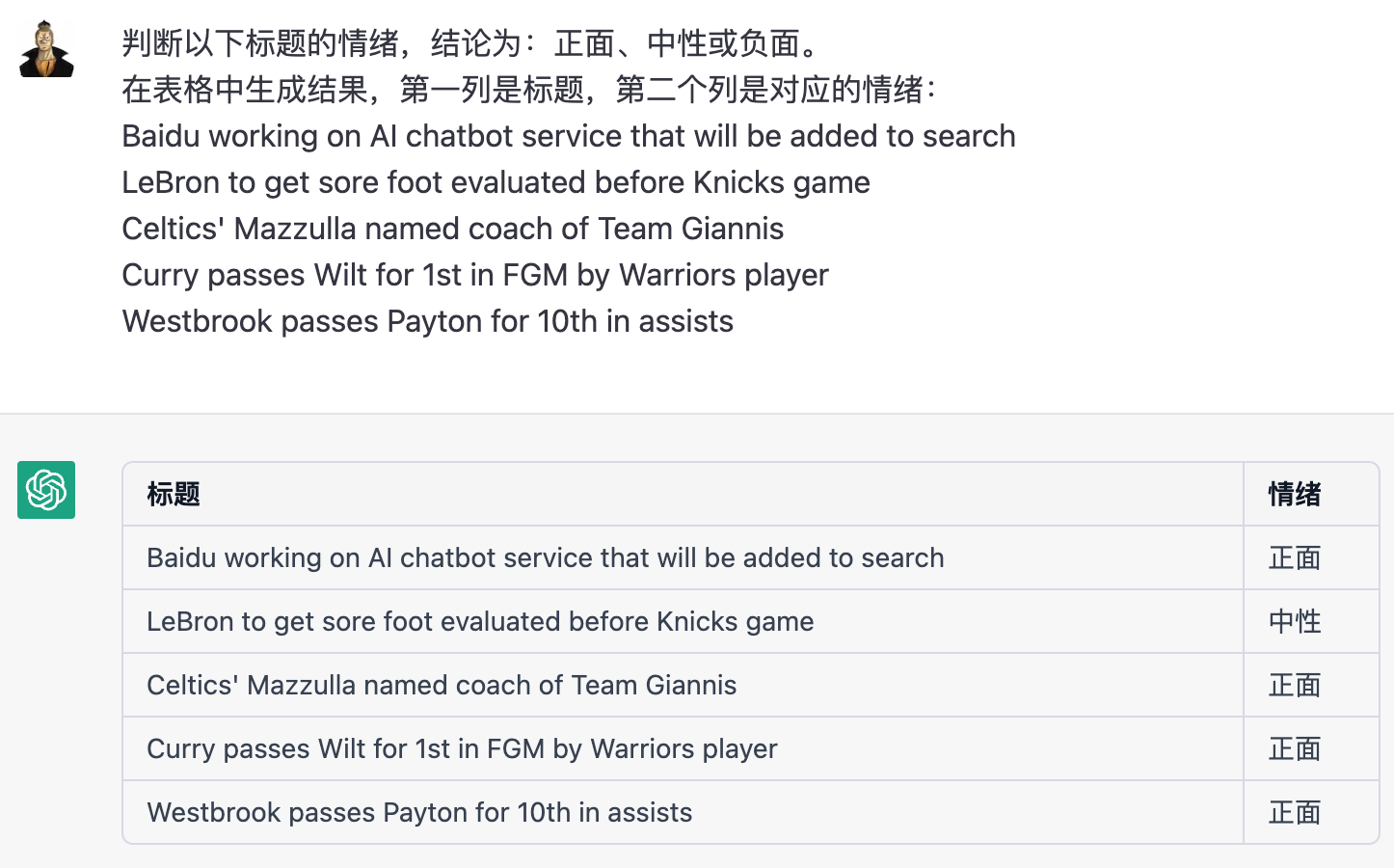 中文指令:判断以下标题的情绪,结论为:正面、中性或负面。在表格中生成结果,第一列是标题,第二个列是对应的情绪:…