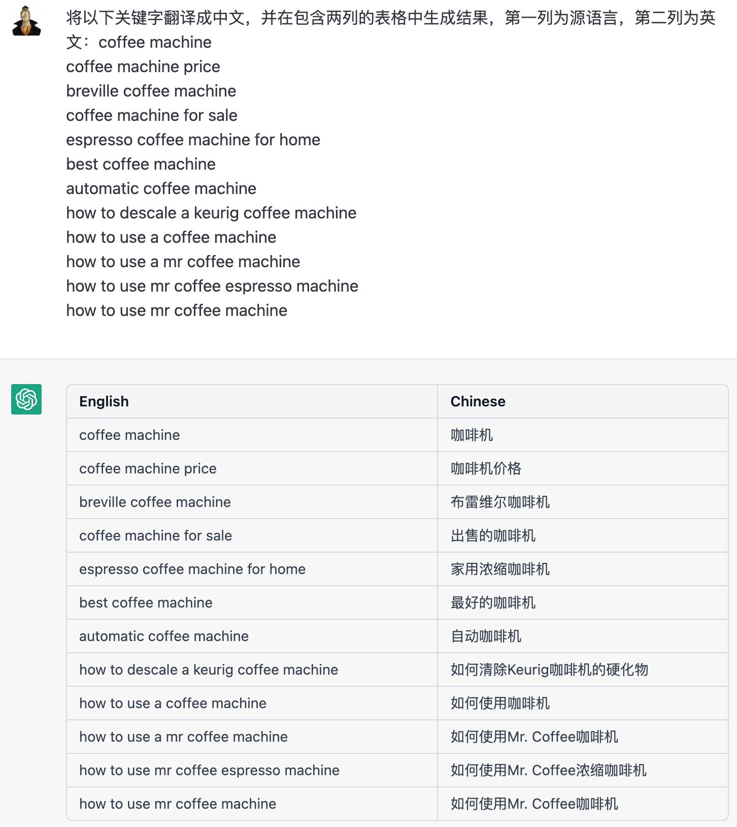 中文指令:将以下关键字从<源语言>翻译成<输出语言>,并在包含两列的表格中生成结果,第一列为<源语言>,第二列为<输出语言>: