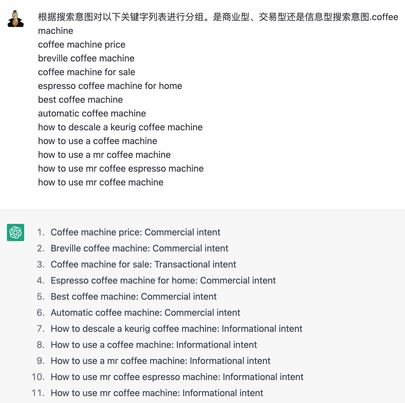 中文指令:根据搜索意图对以下关键字列表进行分组。是商业型、交易型还是信息型搜索意图:…