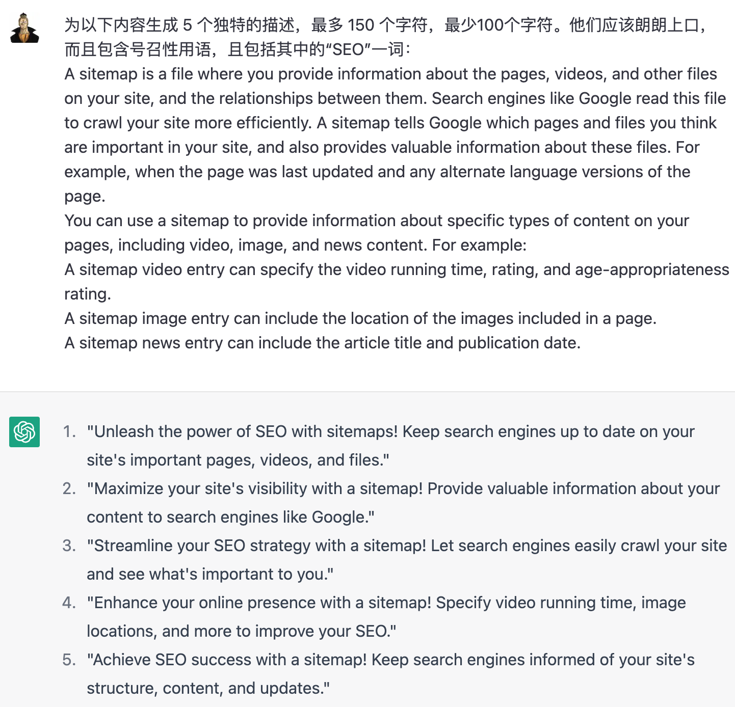如生成标题,ChatGPT 也可以生成 description,并且还可以要求内容吸引人,包含引导性。