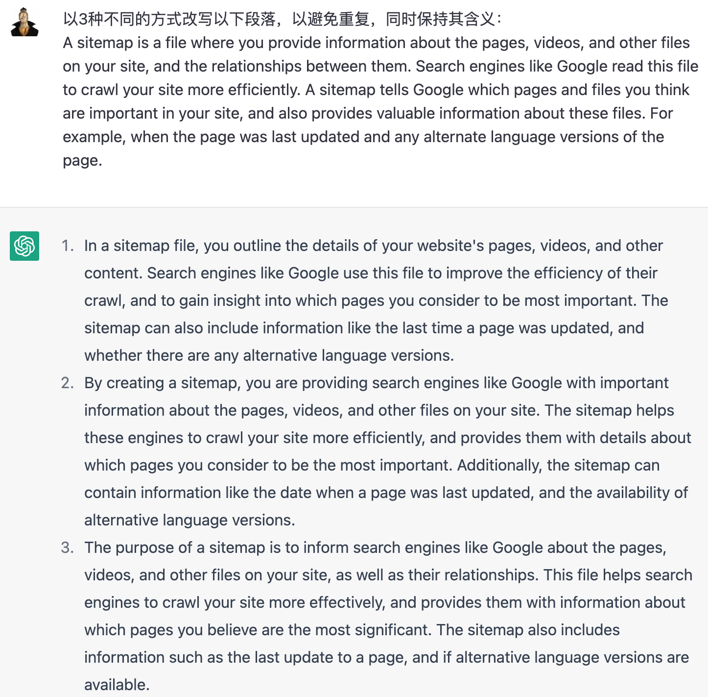 英文指令:Rephrase the following paragraph in X different ways, to avoid repetition, while keeping its meaning: …