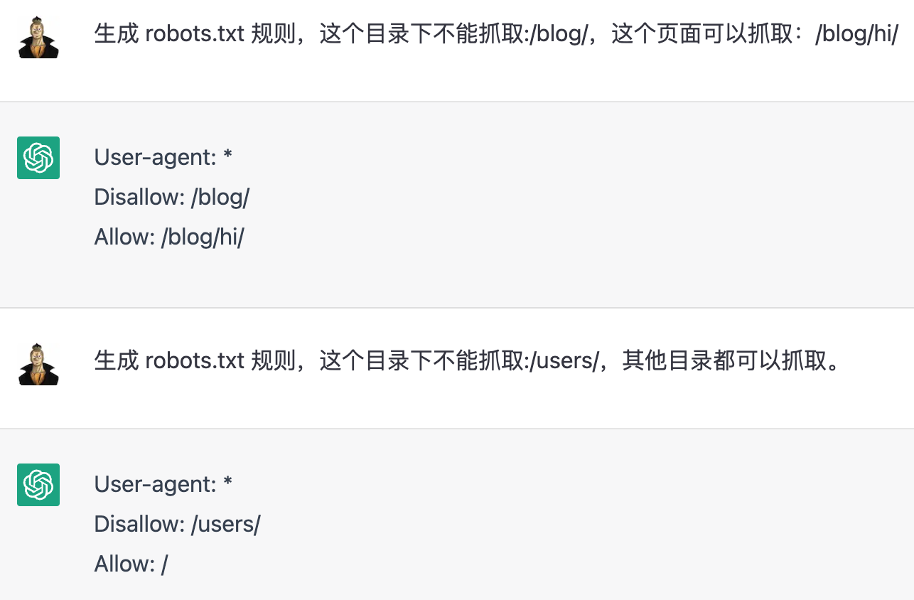 中文指令:生成 robots.txt 规则,这个目录下不能抓取:<待屏蔽URL>,这个页面可以抓取:<可抓取URL>,其他都可以抓取。