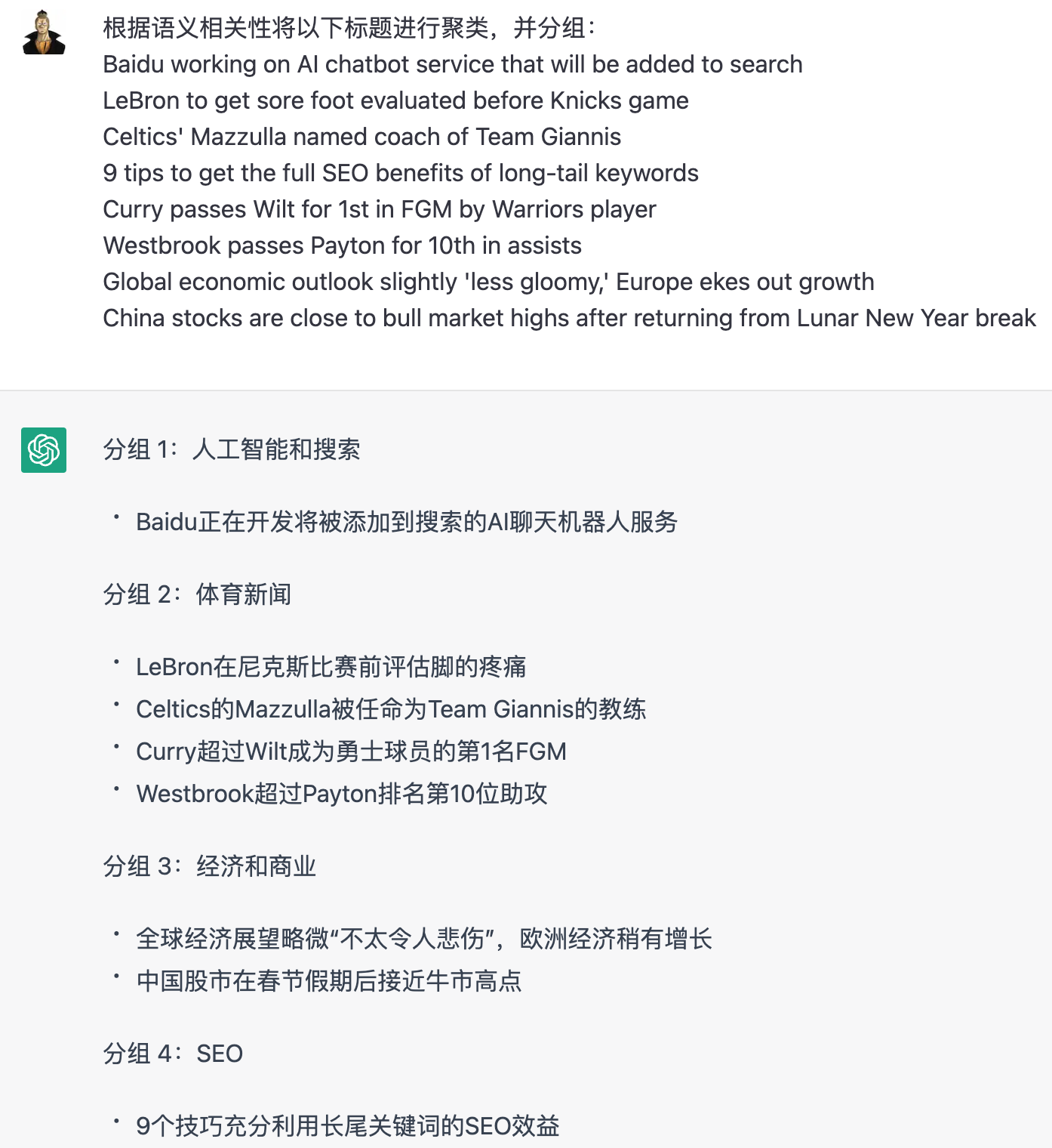中文指令:根据语义相关性将以下标题聚类到组中:…