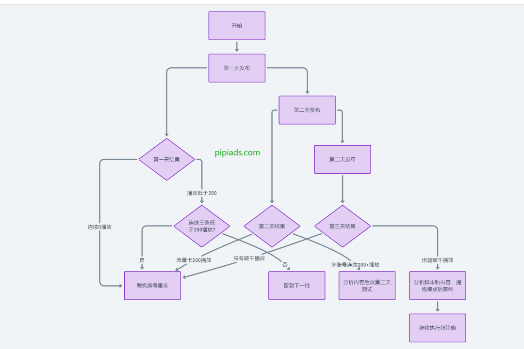 第一天:三台手机,连续发三条,间隔发布,第一天连续0播,刷机换号重来。低于200播放,几十波,连续三条没有200+的,刷机换号重来。高于200+,留到下一批
