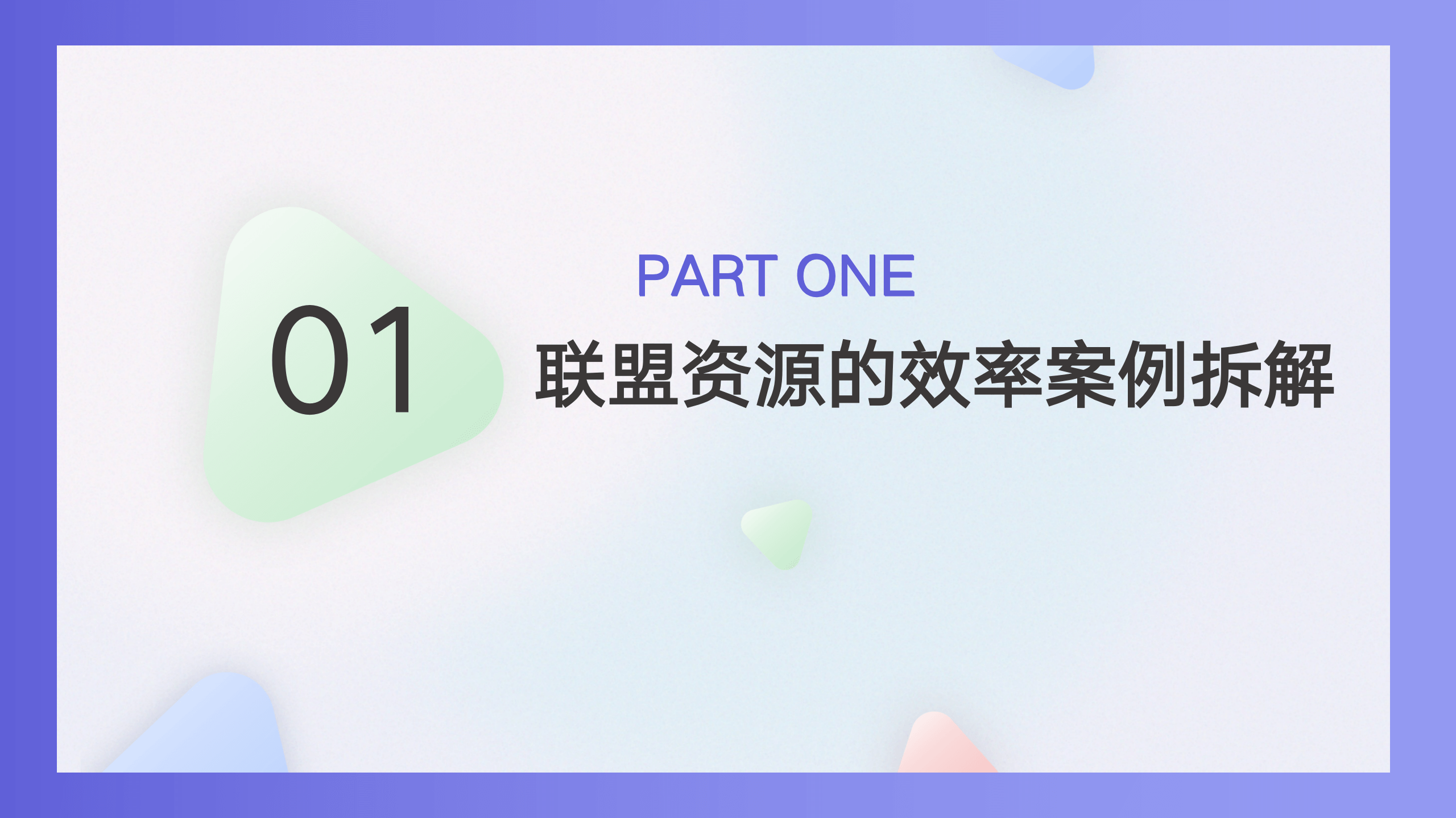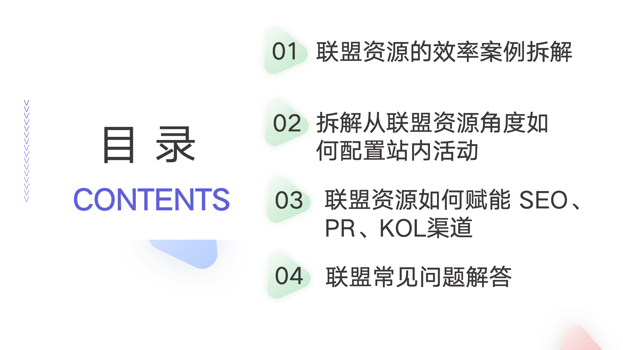 主要讲四个内容:第一,联盟资源效率案例拆解;第二,拆解从联盟资源角度如何配置站内活动;第三,联盟资源如何赋能SEO、PG、KOL渠道;第四,联盟常见问题解答。