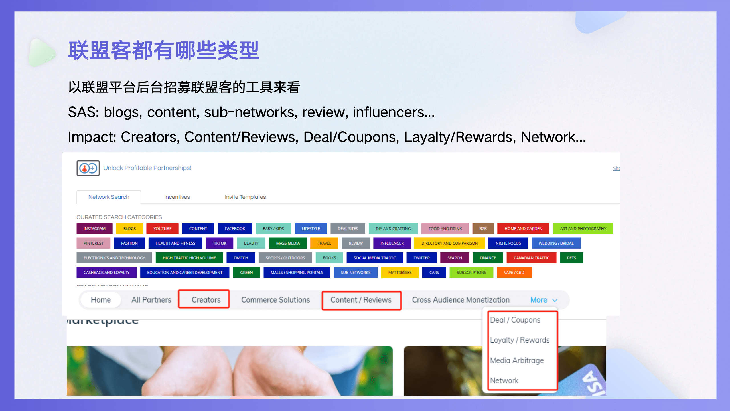 以联盟平台后台招募联盟客的工具来看,可以看到有blogs、content、sub-networks、review、KOL等等;Impact分为Creators、Content/Reviews, Deal/Coupons等等比较常见的类型。