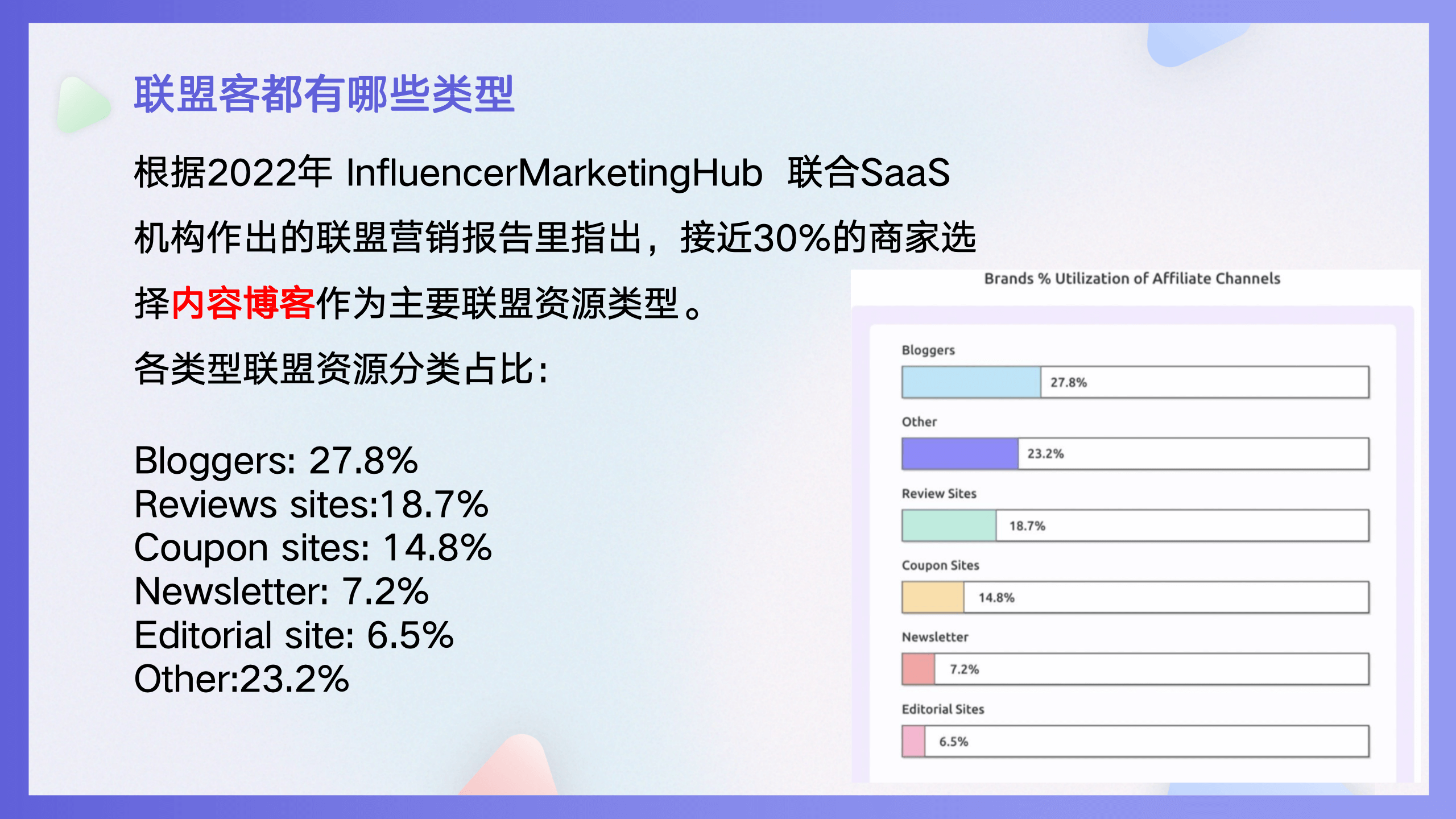 根据2022年InfluencerMarketingHub联合SaaS机构作出的联盟营销报告里指出,接近30%的商家选择内容博客作为主要联盟资源类型。大家可以看到像Bloggers、Reviews sites对比比较大,因为他们对品牌的宣传、PR、口碑宣传都会比较到位,可能相比折扣网站更受到一些品牌的喜欢,如果你长时间做一些折扣站或者是Coupon,会让大家觉得你这个品牌是卖便宜货的,天天给折扣,各种折扣、全场五折等等,所以很多商家不太愿意我就一直做折扣类型的网站,所以会有意识的控制,或者觉得联盟的价值并不仅仅是做Coupon站了,可能会嫌弃,时间长了觉得联盟只做内容型的,合作一些博主、合作一些内容型的美的,这样就可以节省PR和KOL的钱。
