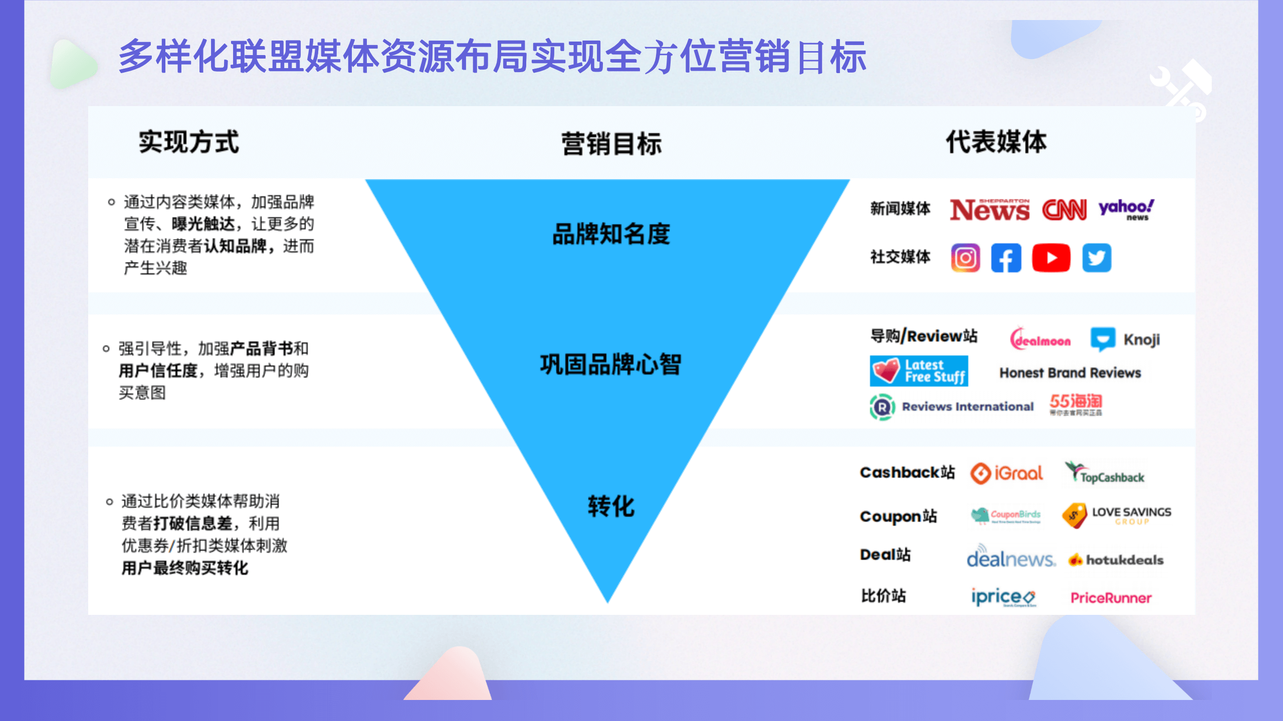 到中间可能有一些强引导性的联盟客,有点像国内的小红书,通过KOC或者专门做测评类网站帮助引流到官网进行推广。最后到转化这一个环节,就是一些折扣,比如说Coupon站、Deal站、比价站。假设你现在买一些东西,不知道买什么牌子,可能到小红书搜索攻略,这个时候有一大批红人和你说什么牌子最好用,这个时候可能就处在中间导购类型的网站或者KOC,可能最后那个博主介绍到最后就说最近有发现这个网站有一些折扣,大家可以用我的折扣码去买,这个时候给了一些折扣,可能最终促成了我来到你这里,看到了你对这个品牌的分享,知道这款产品不错,还有折扣,是不是就可以尝试一下,整个环节完成了订单的转化。