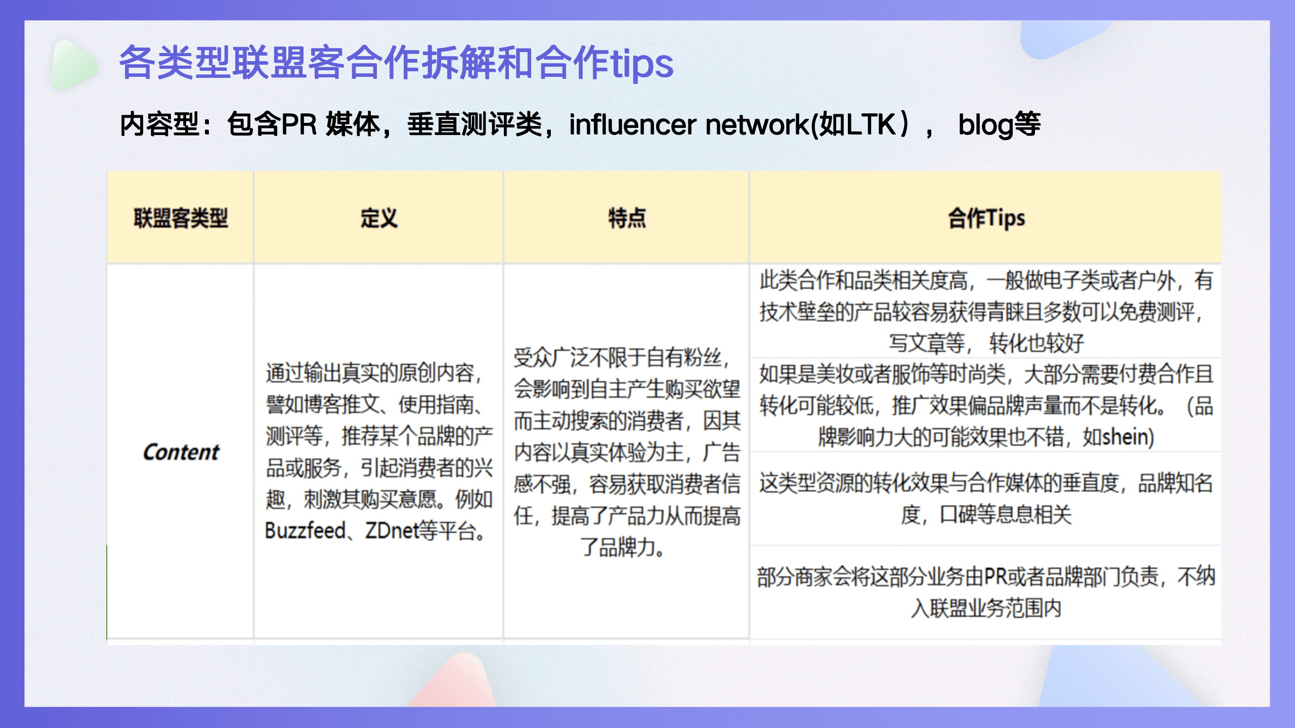 合作品类相关度比较高,如果你真的想看到效果,第一次做PR类型的合作,大家可能只是初步对这个品牌产生了认知、产生了一些兴趣,可能不会立马就买了,所以一般情况下和联盟的这类合作和品类的相关性特别高,一般做电子类、户外有一些技术类的产品比较受到欢迎,可能要一个你的产品,可能写一个产品的测评,可能就上线了,大部分是可以免费测评的,或者给你写文章,转化相对来说比较好一些。但是如果是美妆、服饰类,就是客单价比较低,看起来有什么技术含量,品牌要求比较高,大部分可能需要付费,而且转化可能比较低,因为相对来讲在国外大牌我们并不占优势,特别在品牌力这方面,如果这块做联盟推广效果可能偏品牌声量,而不是转化,品牌影响力大可能转化效果也不错,比如说SHEIN,这类资源转化效果与合作媒体的成熟度、品牌知名度、口碑等息息相关。如果说你要做某个地区的内容性的资源要调研一下这个地方的产品受众,他们购买的时候最喜欢参考哪一个类型的网站、联盟客资源,通过这些定位到可以合作哪一类资源进行你的联盟推广。有一些品牌他们将这部分业务纳入PR或者品牌部门负责,不归到联盟业务范围内,但是联盟依然可以和这些资源进行合作。