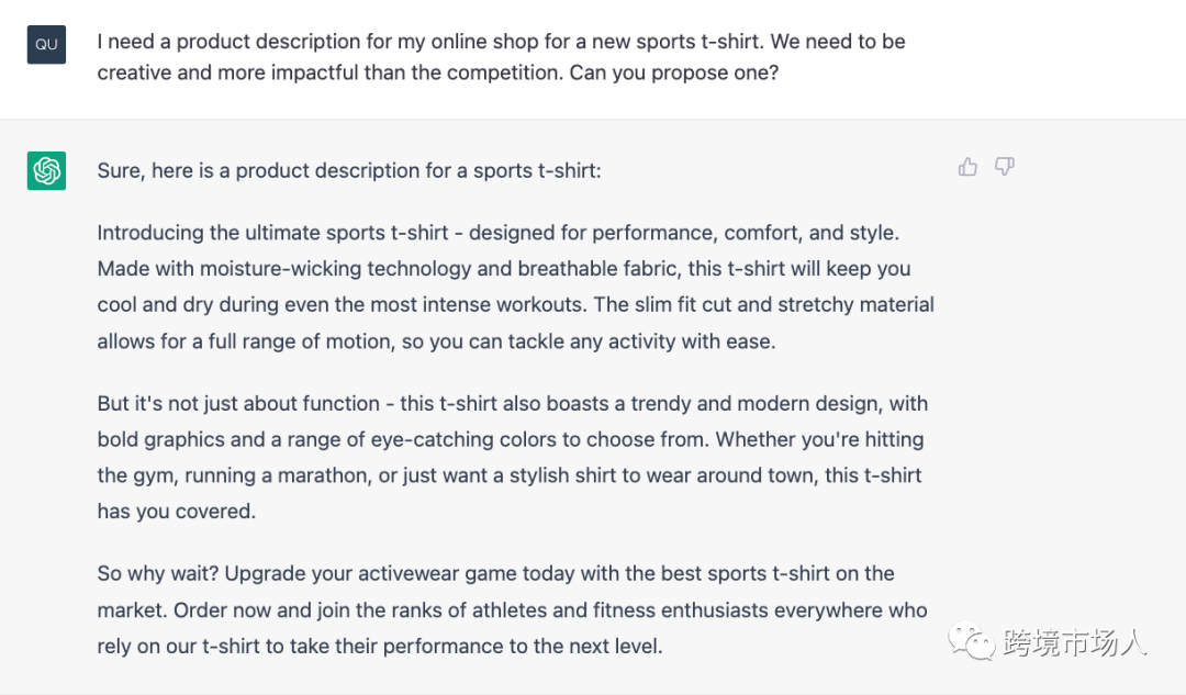ChatGPT 可用于生成有效的产品描述,展示产品的独特卖点。例如,你正在推出新的运动休闲服系列,ChatGPT 可以创建强调吸湿排汗、弹性面料、舒适合身和服装时尚设计的描述。