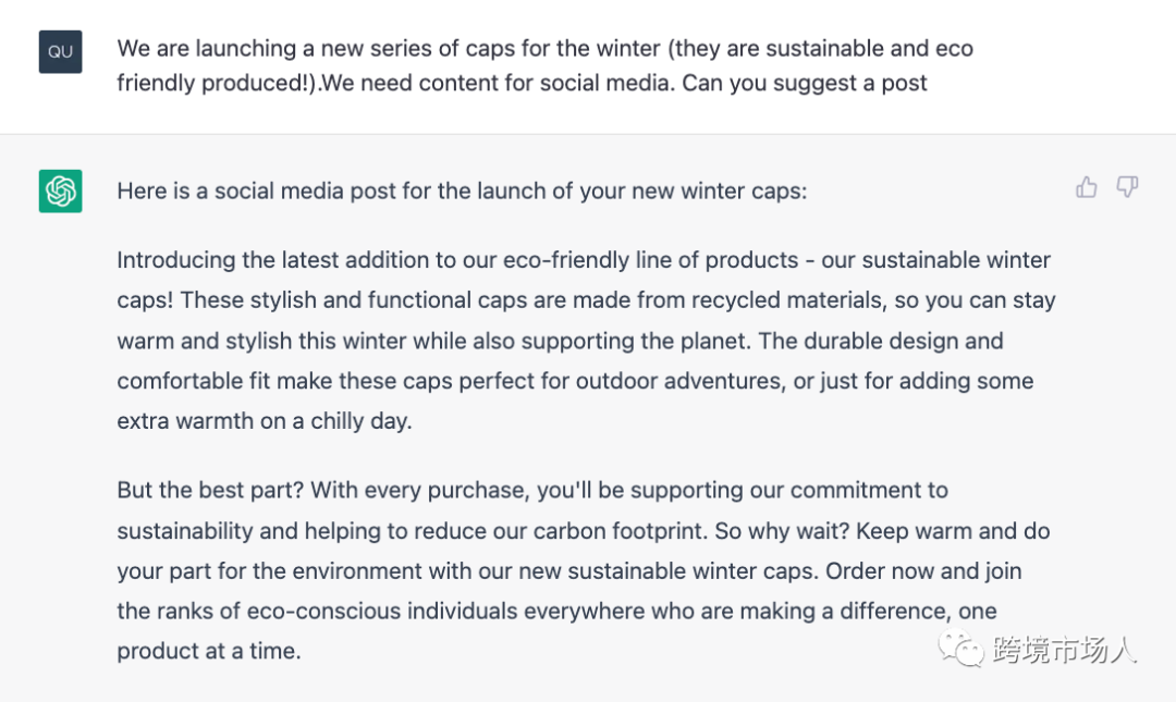 ChatGPT 还可以为社交媒体平台生成不错的内容。如果你正在推出一款新产品,ChatGPT 可以创建一个促销帖子,展示该产品的主要功能和优势。这可能包括为产品照片制作醒目的标题或创建突出产品独特卖点的完整帖子。