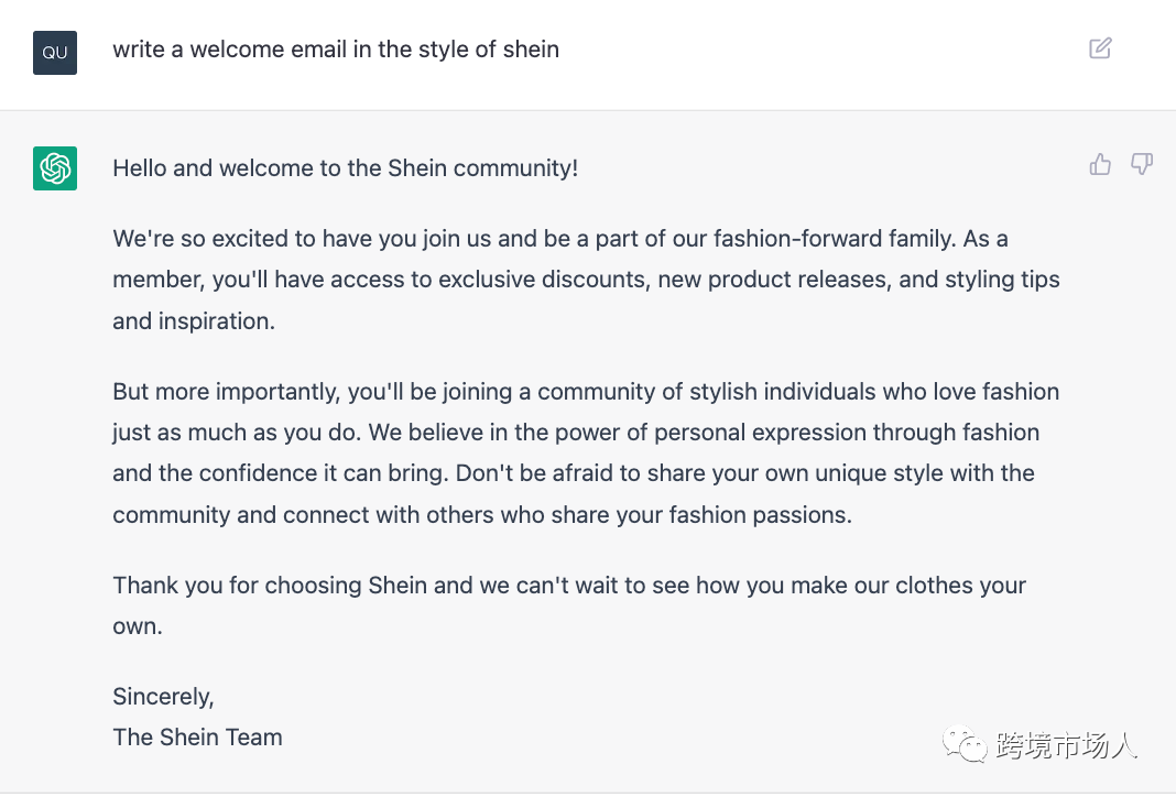 ChatGPT在内容制作方面可以为跨境卖家提供支持,电子邮件也肯定也是可以的。随着电子邮件营销自动化的兴起,可能需要制作大量内容,那么时间及人手不足可能是你面临的最大挑战,大家应该都知道shein,看看是否可以使用ChatGPT为所有新订阅者生成一封欢迎的电子邮件。